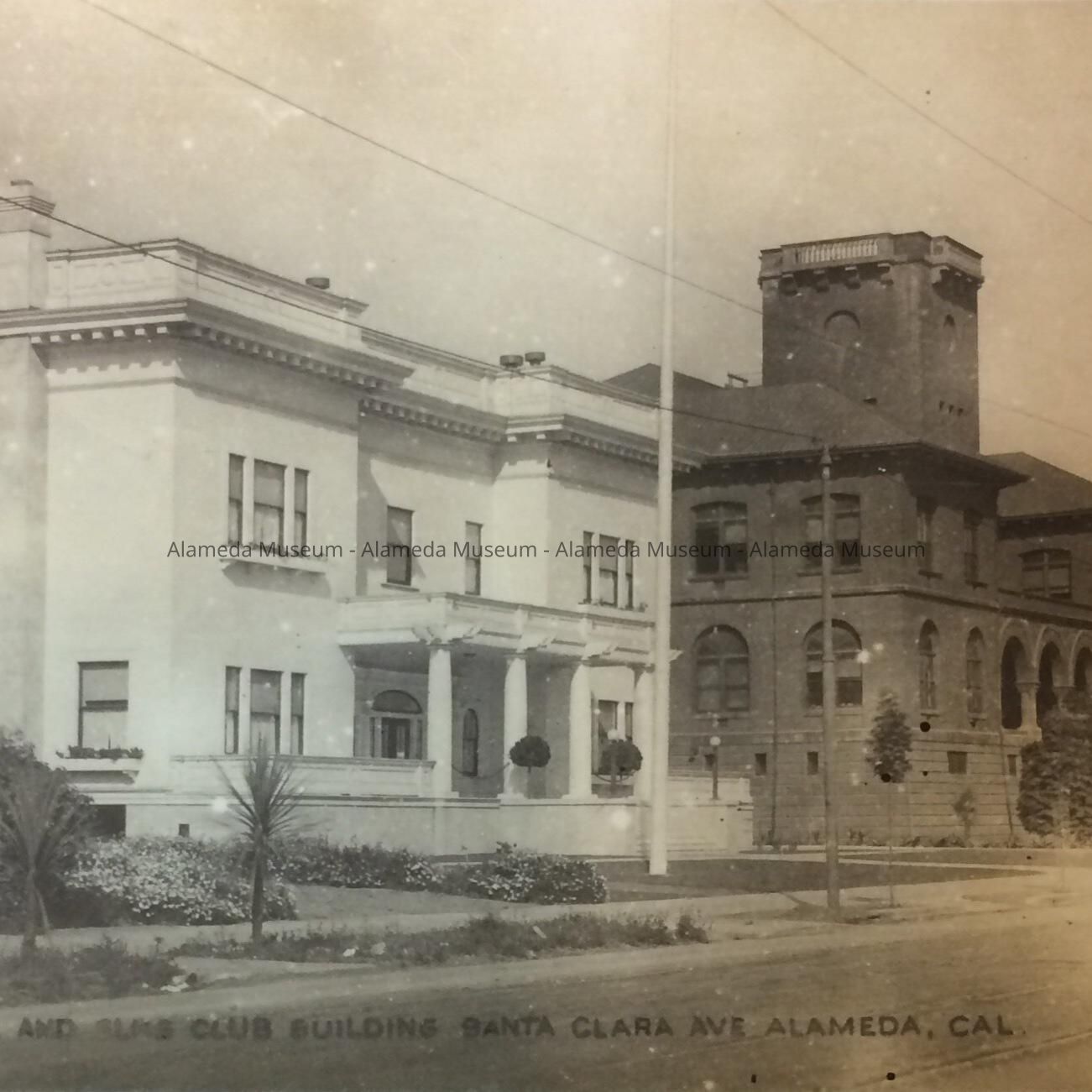 Postcard depicting the Elks Club Building (erected 1909), and the Alameda City Hall (erected 1895-96).