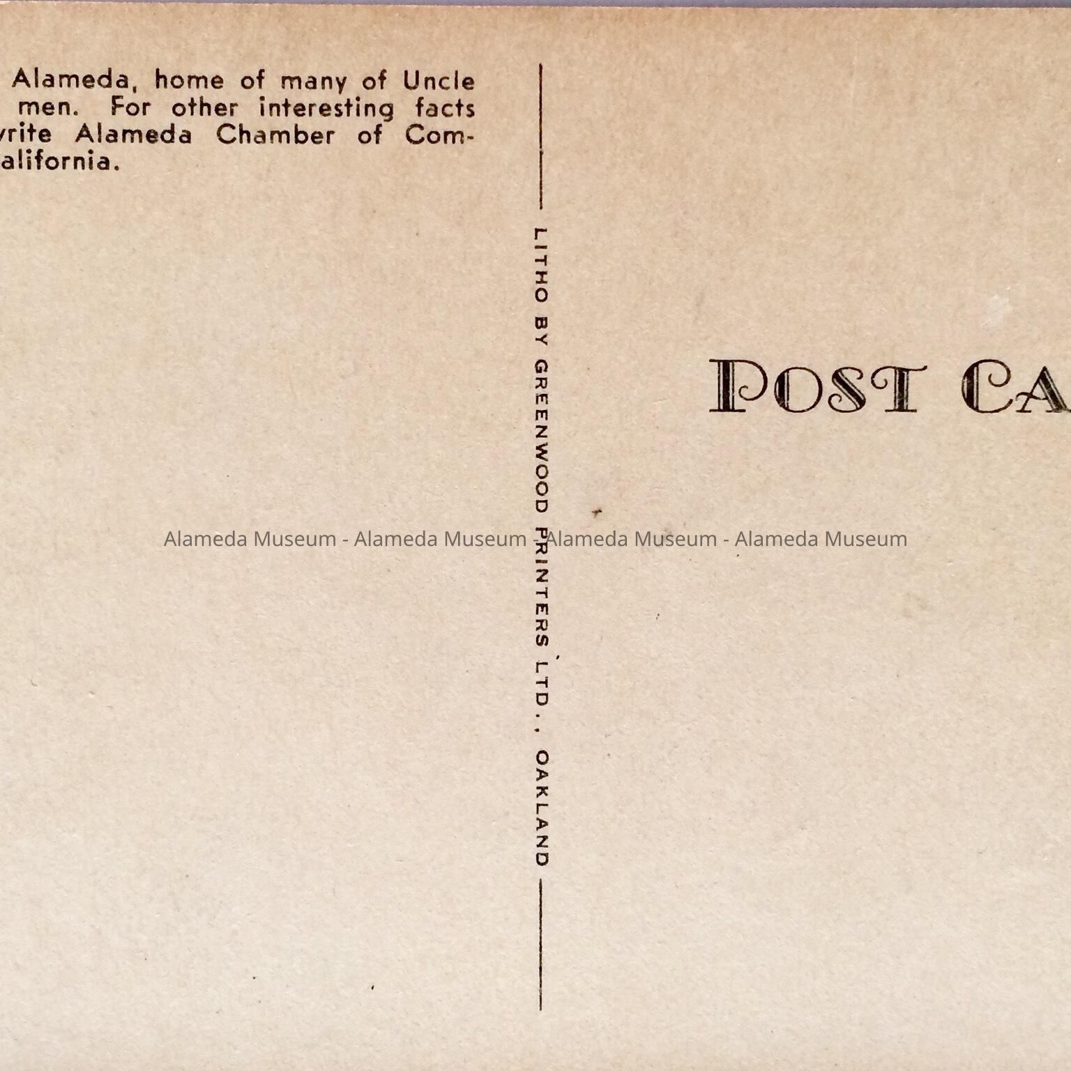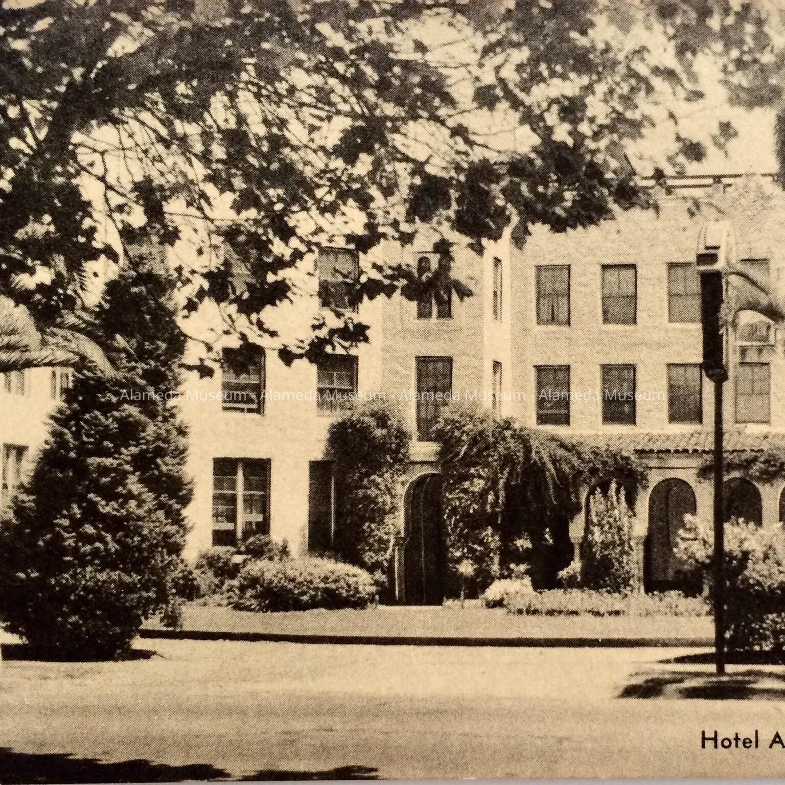 BLACK-AND-WHITE PHOTOLITHOGRAPHIC POSTCARD, WITH CAPTION, "HOTEL ALAMEDA, ALAMEDA, CALIF." GREENWOOD PRINTERS, OAKLAND, CALIF., PUBLISHERS. UNCIRCULATED.