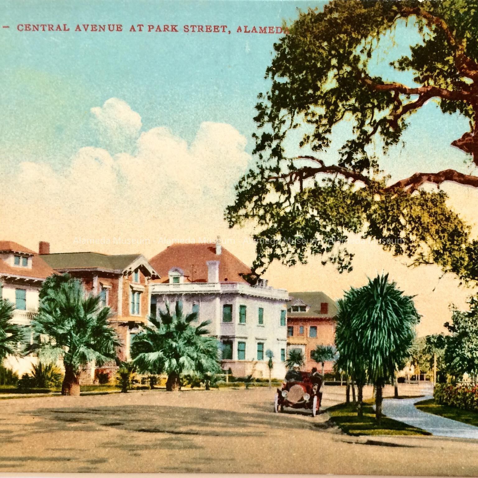 POSTCARD DEPICTING MANSIONS ON CENTRAL AVENUE, POSSIBLY NEAR GRAND STREET, ALAMEDA, 1915.