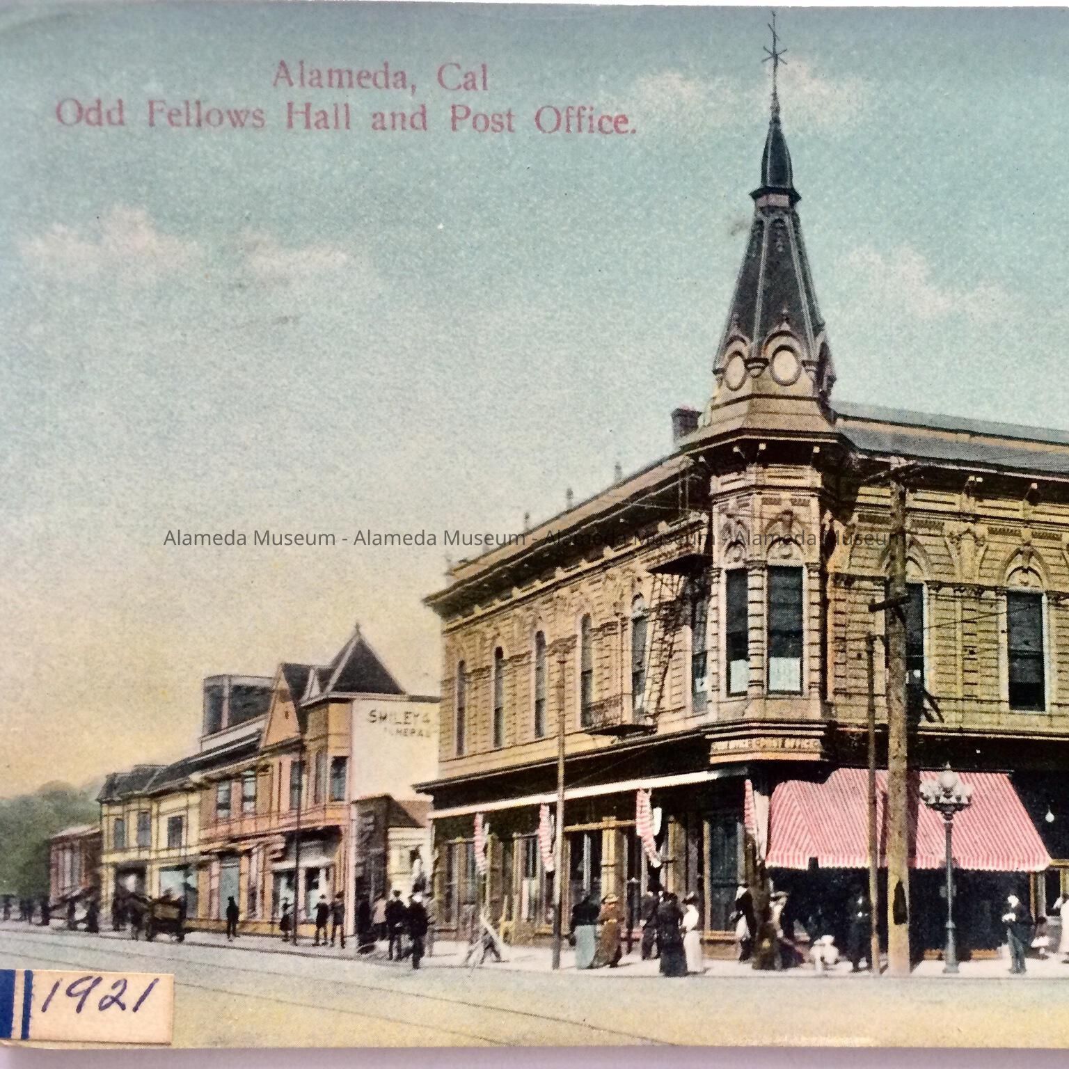 POSTCARD DEPICTING THE ODD FELLOWS HALL, NORTHWEST CORNER, SANTA CLARA AVENUE AND PARK STREET, ALAMEDA, CALIFORNIA.