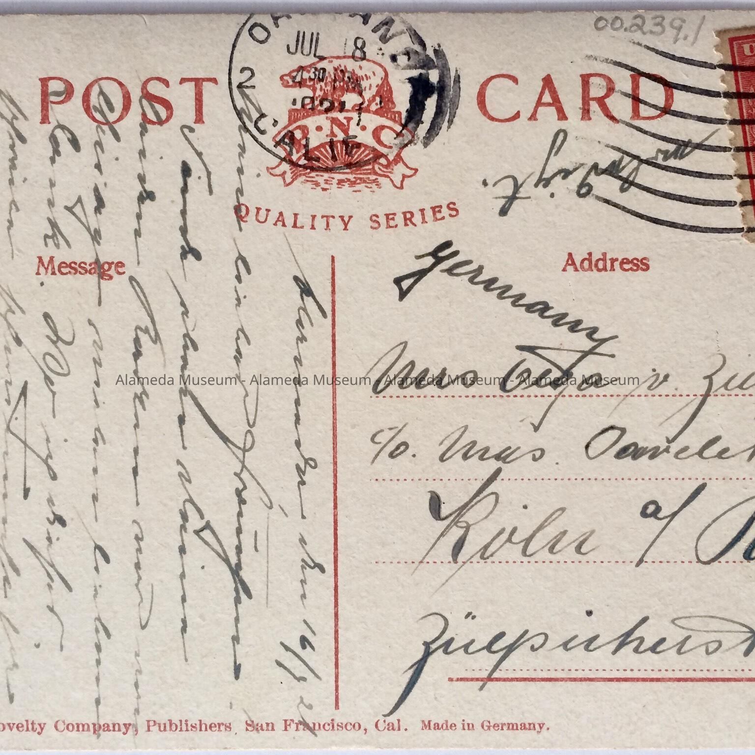 COLORED PHOTOLITHOGRAPHIC POSTCARD, WITH CAPTION, "ALAMEDA, CAL. ODD FELLOWS HALL AND POST OFFICE." PACIFIC NOVELTY Co., PUBLISHERS. L 3-1/2" X W 5-1/2"