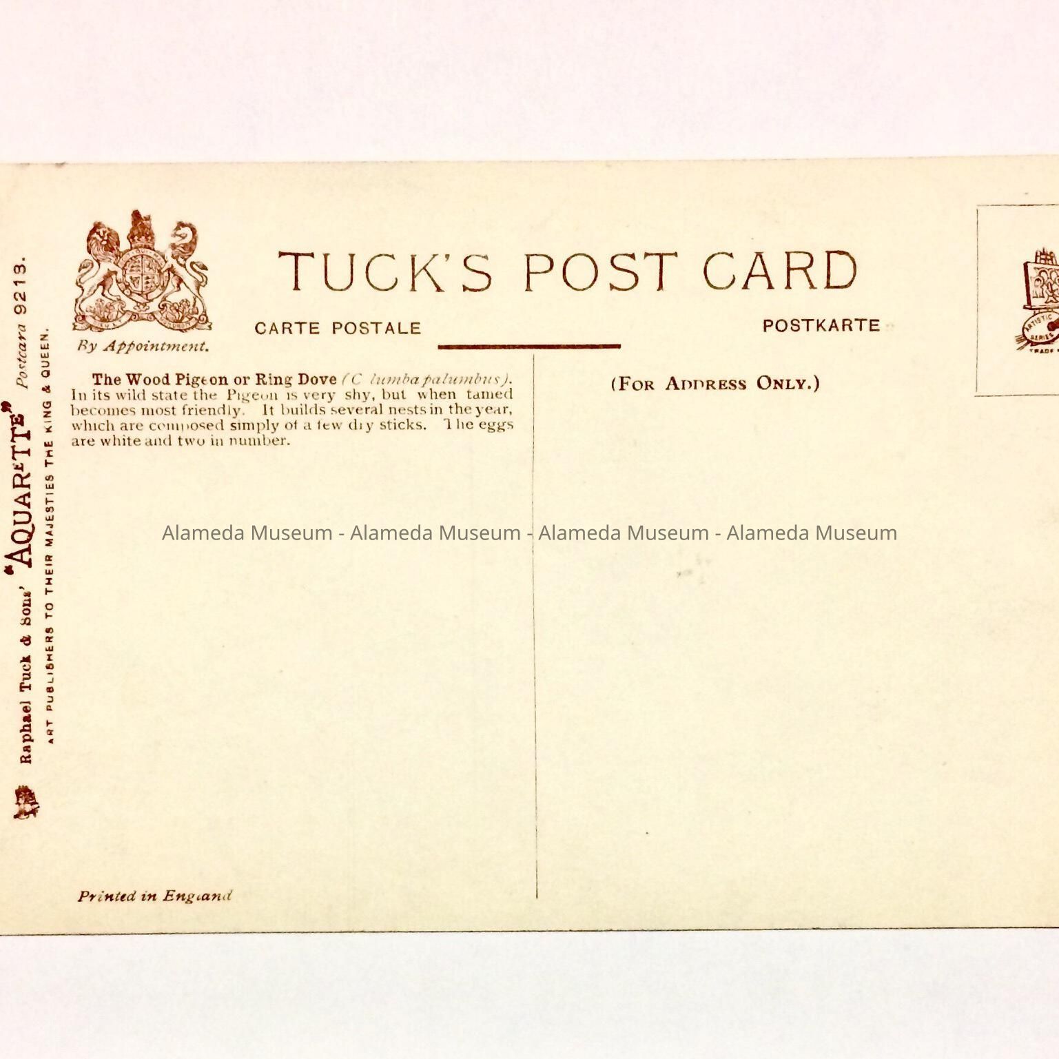 LITHOGRAPHIC POST CARD DEPICTING A WOODEN PIGEON OR RING DOVE, WITH EGGS. POST CARD WAS ISSUED BY TUCK'S POST CARD CO., ENGLAND. UNCIRCULATED.