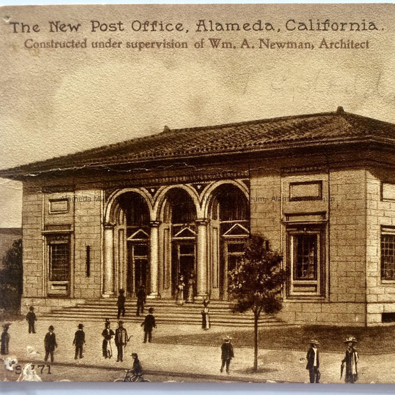 SEPIA-TINTED LITHOGRAPHIC POSTCARD, WITH CAPTION, "THE NEW POST OFFICE, ALAMEDA, CALIF."
