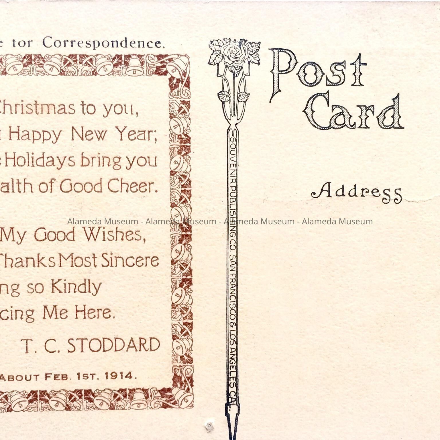 POSTCARD DEPICTING A DRAWING OF THE ALAMEDA POST OFFICE, WITH A CHRISTMAS MESSAGE FROM T C STODDARD, THEN POSTMASTER, CITY OF ALAMEDA.