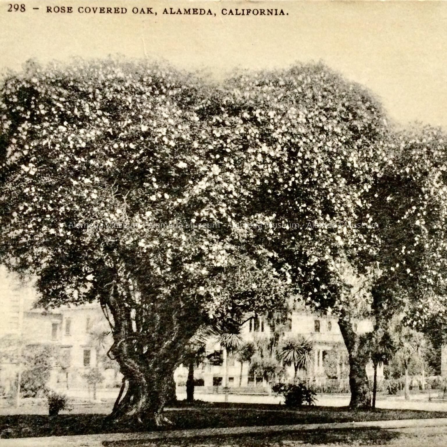 HISTORY OF OBJECT: PHOTOGRAPHIC POSTCARD DEPICTING ROSE-COVERED TREES (2) AT THE SOUTHWEST CORNER OF GRAND STREET AND CENTRAL AVE., ALAMEDA.