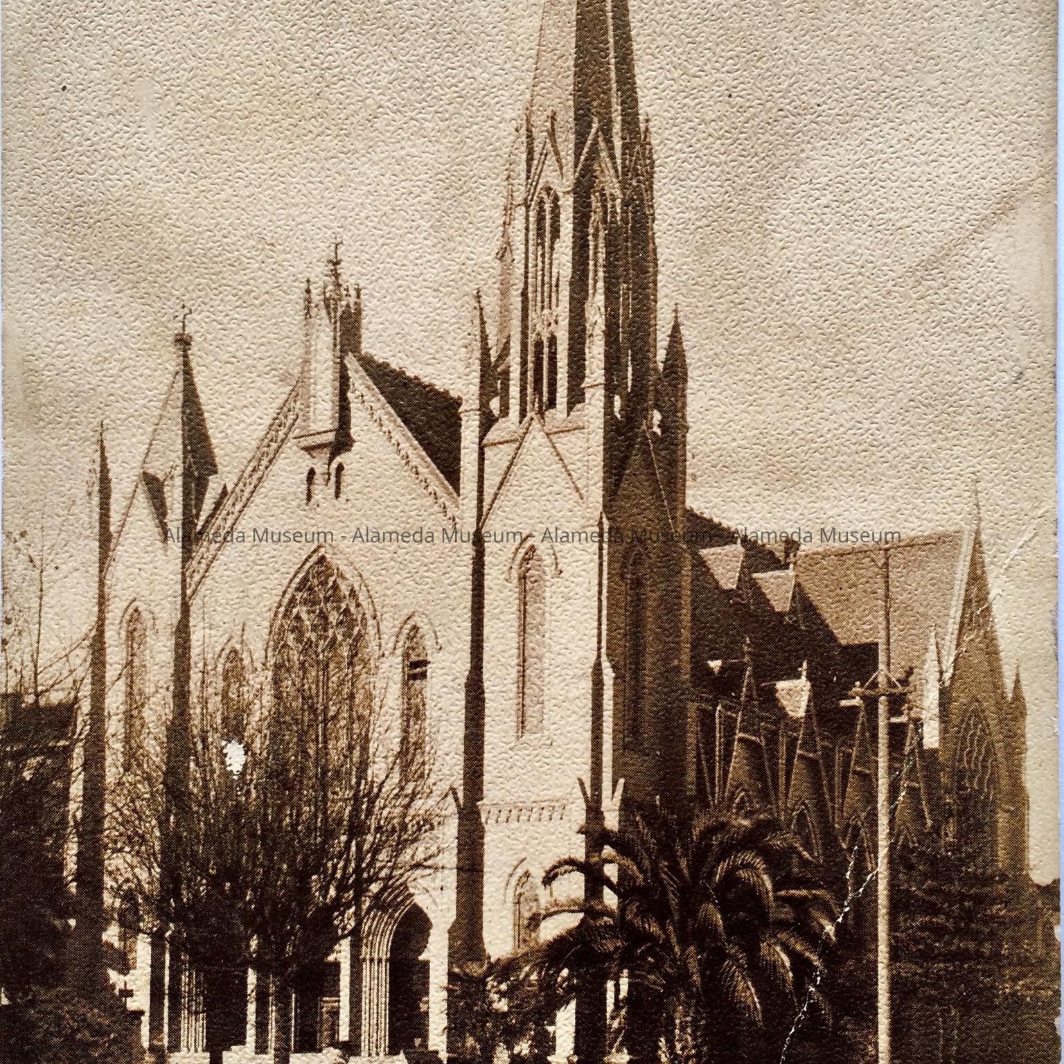 DESCRIPTION: A SEPIA-TINTED PHOTOLITHOGRAPHIC POSTCARD, WITH CAPTION, "ST JOSEPH CHURCH, ALAMEDA, CAL."