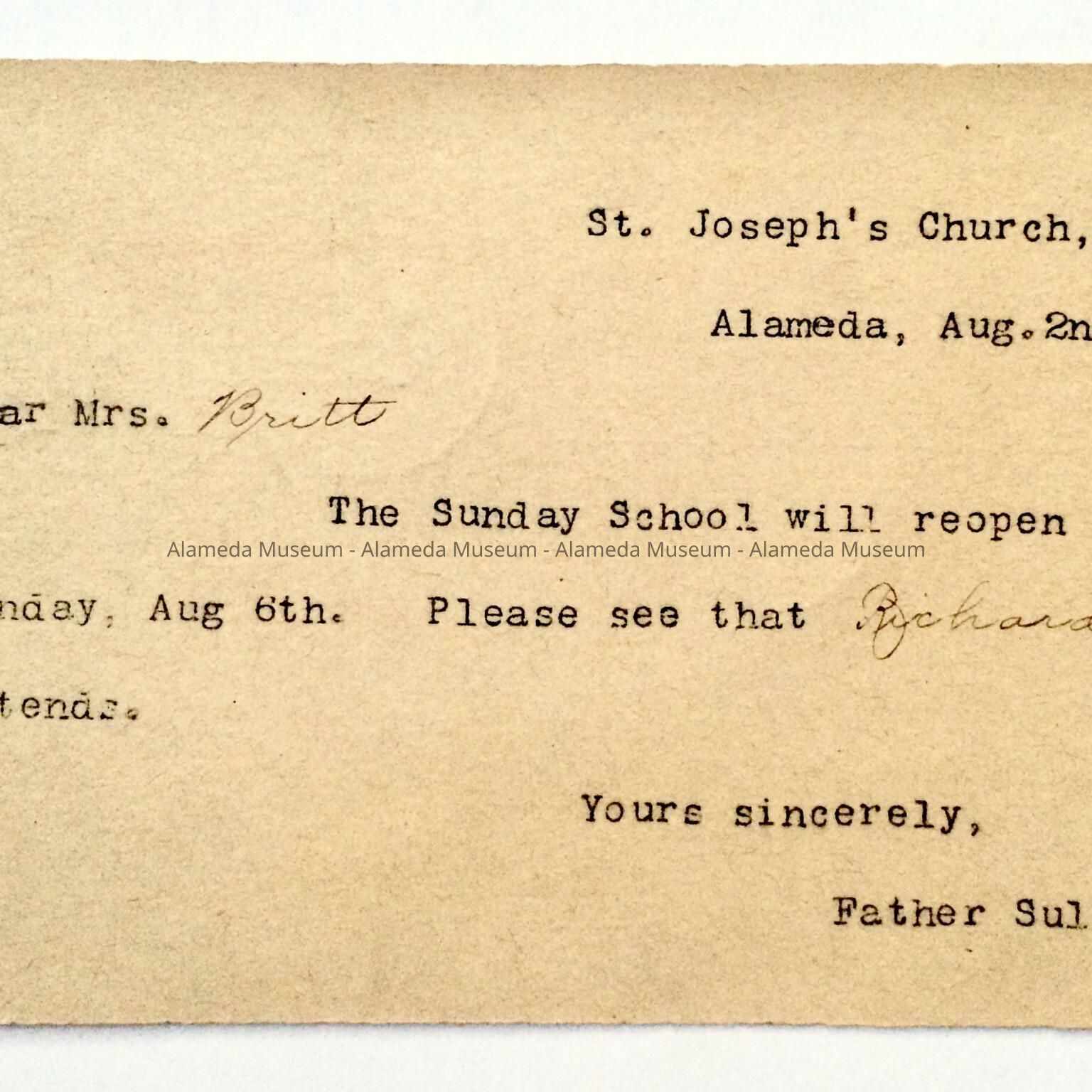 History of Object: Notice to Mrs. Patrick Britt from Father Sullivan, of St. Joseph's Church, dated August 2, 1893, asking that her son Richard attend Sunday School. Richard Britt (Dick) later became a police officer in Alameda, patrolling the west end.