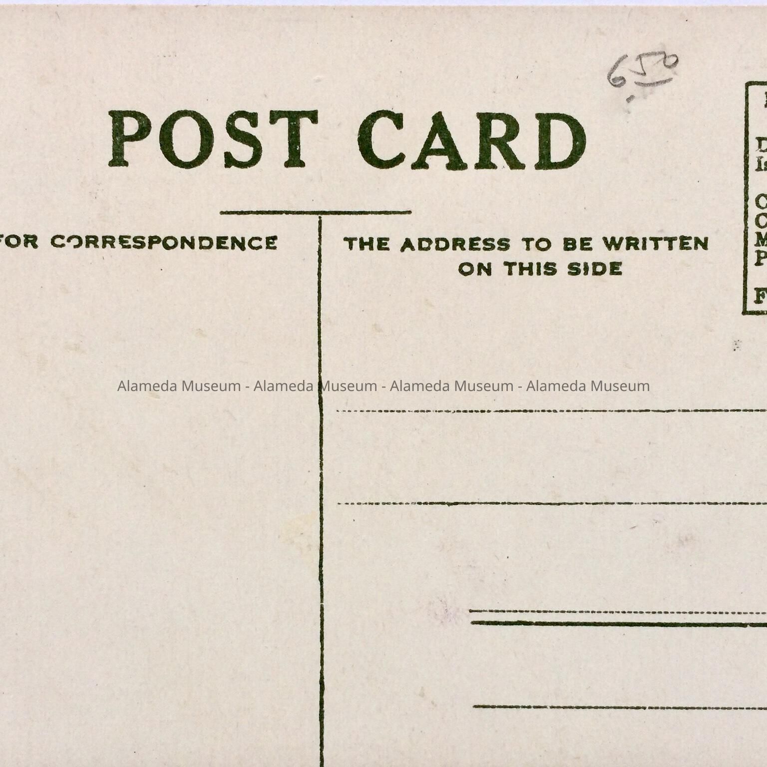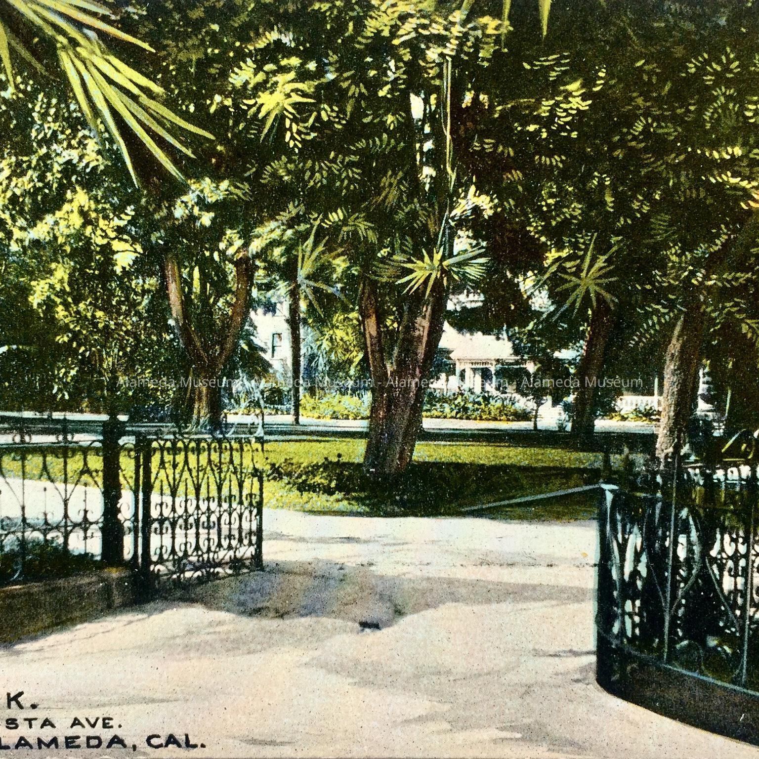 HISTORY OF OBJECT: POSTCARD DEPICTING THE IRON FENCING AND SHRUBBERY OF McKINLEY PARK, BUENA VISTA AVENUE, ALAMEDA, CA. THE JUDGE WAYMIRE MANSION CAN BE SEEN (FAINTLY) IN THE DISTANCE.