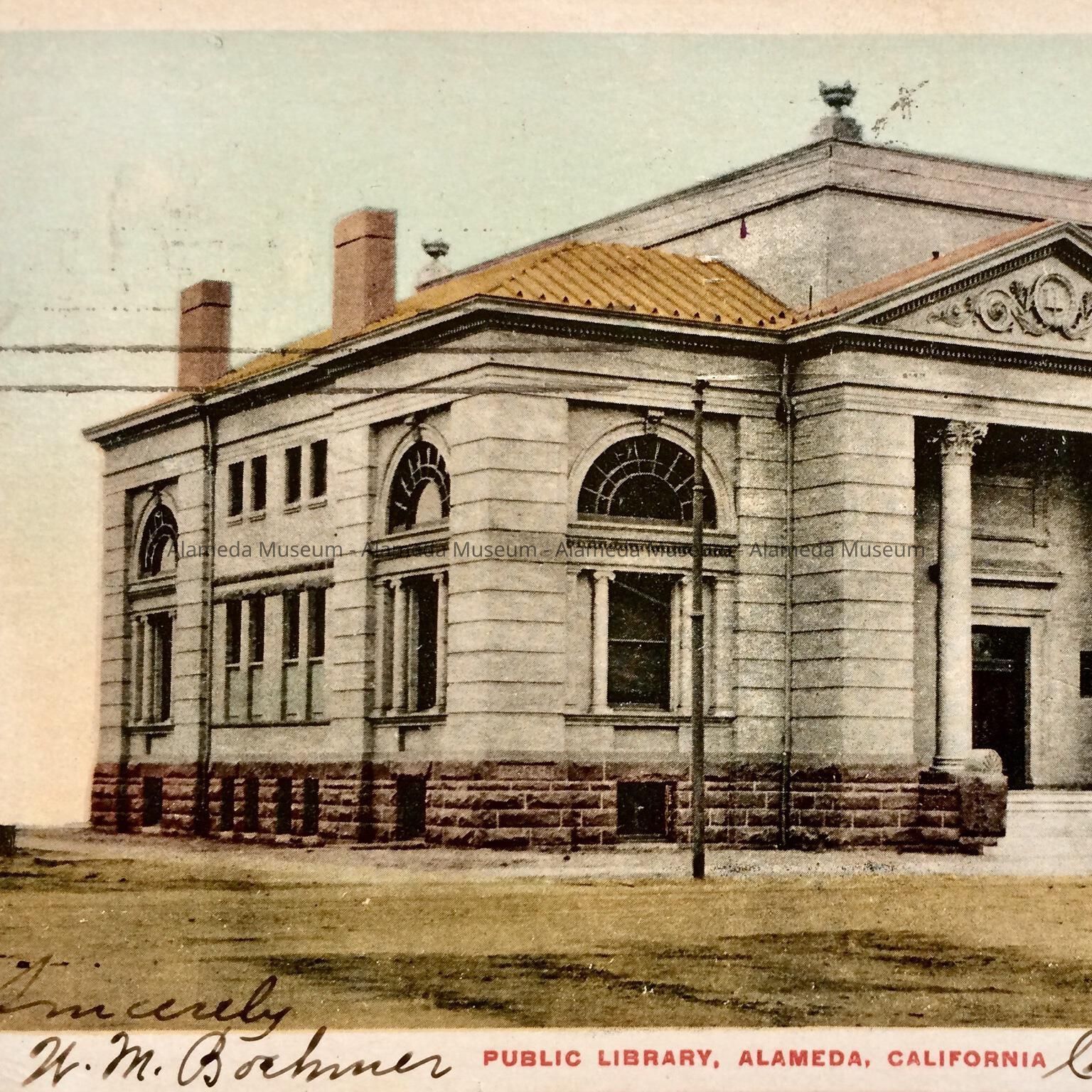 Description: Postcard, of a hand-colored photo of the Public Library, Alameda. Reverse has 1 c. Franklin stamp, and is postmarked Alameda, 1905. Front has message handwritten in black ink, signed, Sincerely, W.M. Boehmer.
