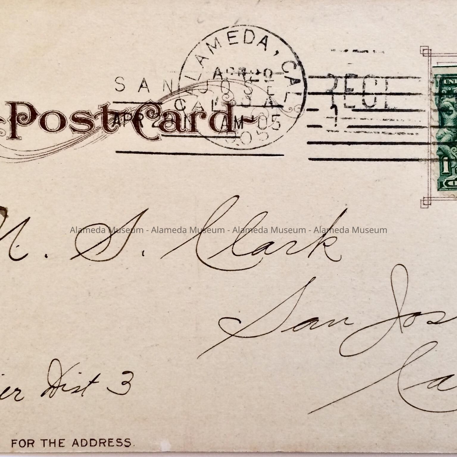 History of Object: Postcard sent to N. S. Clark, San Jose, by William M. Boehmer (1874-1975). The Boehmer family lived in Alameda in 1920 (865 Oak Street) and 1930 (rented 2511 San Jose Ave).