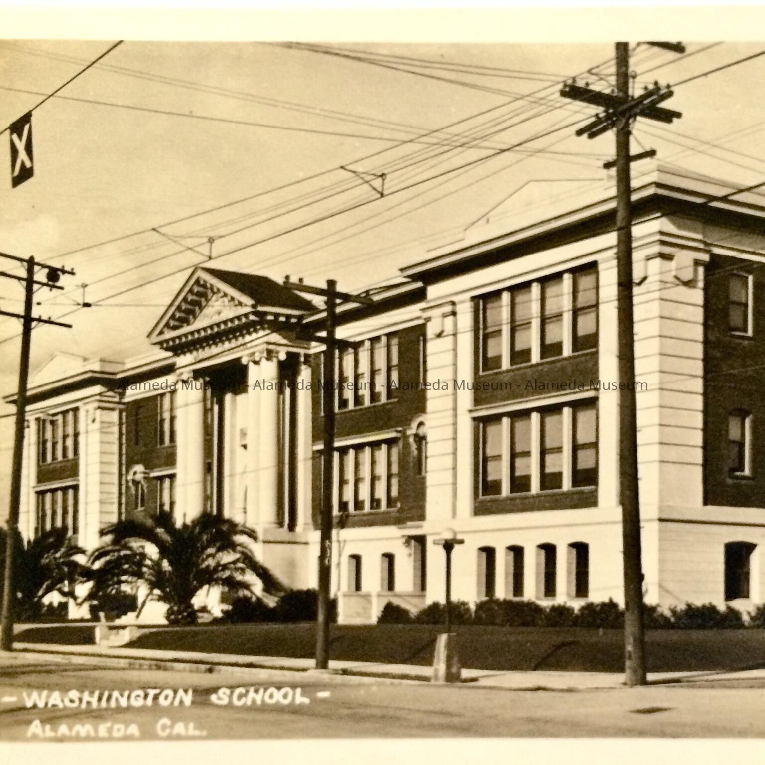 Description: Uncirculated postcard, of a black-and-white photo with white edging of a 3-story building, with pillared portico, with lamppost and caption on negative: - Washington School - Alameda Cal.