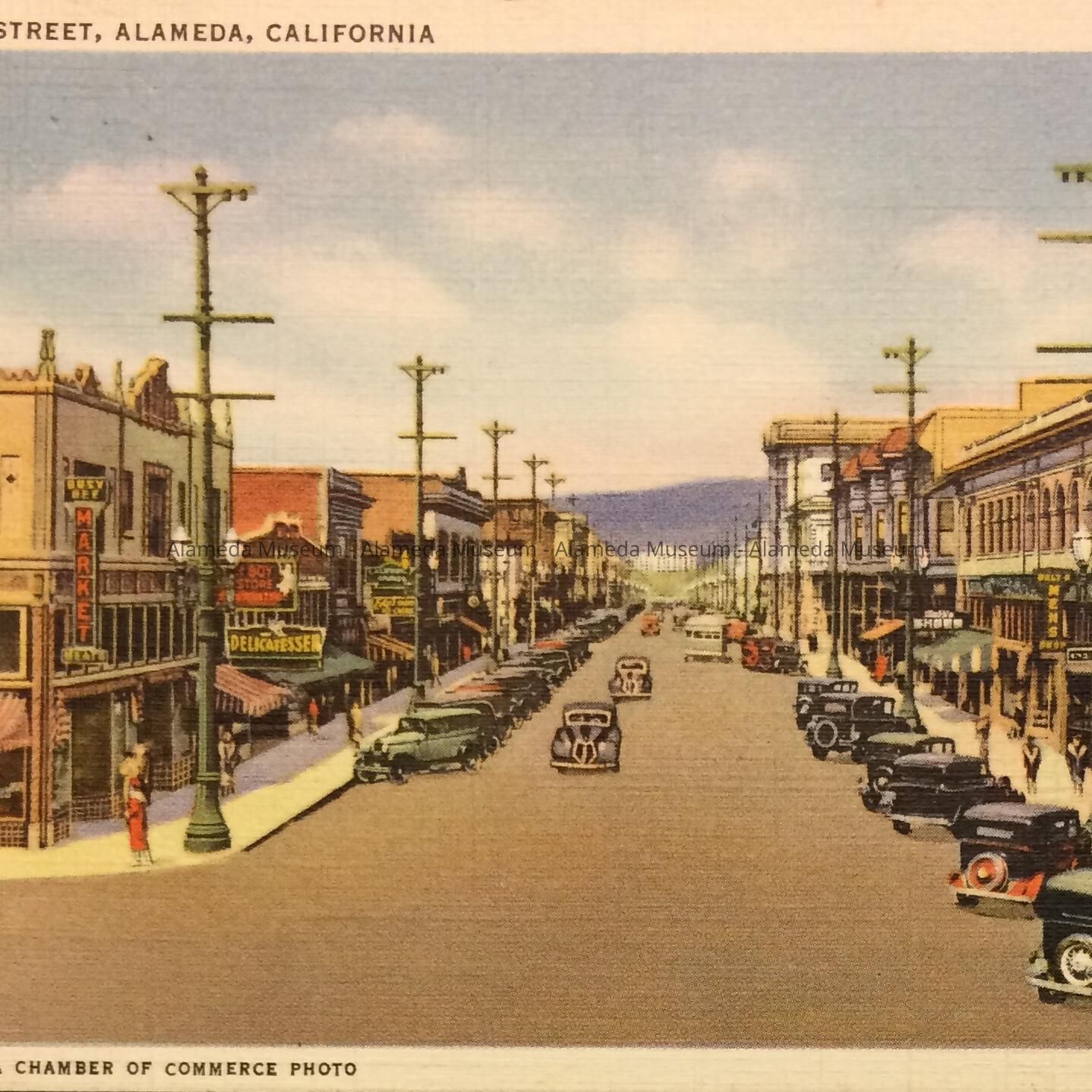 Postcard titled 'Park Street, Alameda, California', with source cited: 'Alameda Chamber of Commerce'.