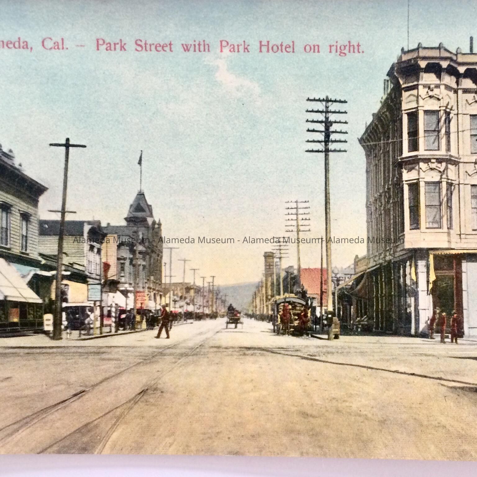 History of Object: Scene of Park Street, looking north toward Oakland from Encinal Avenue. The old Park Hotel, now the site of the main Alameda Fire Department, is well depicted.