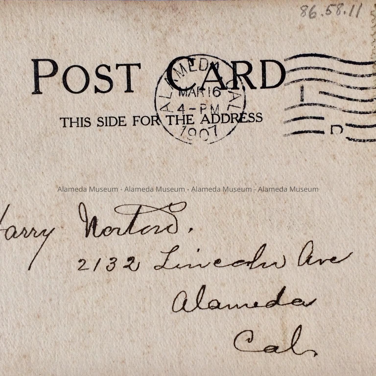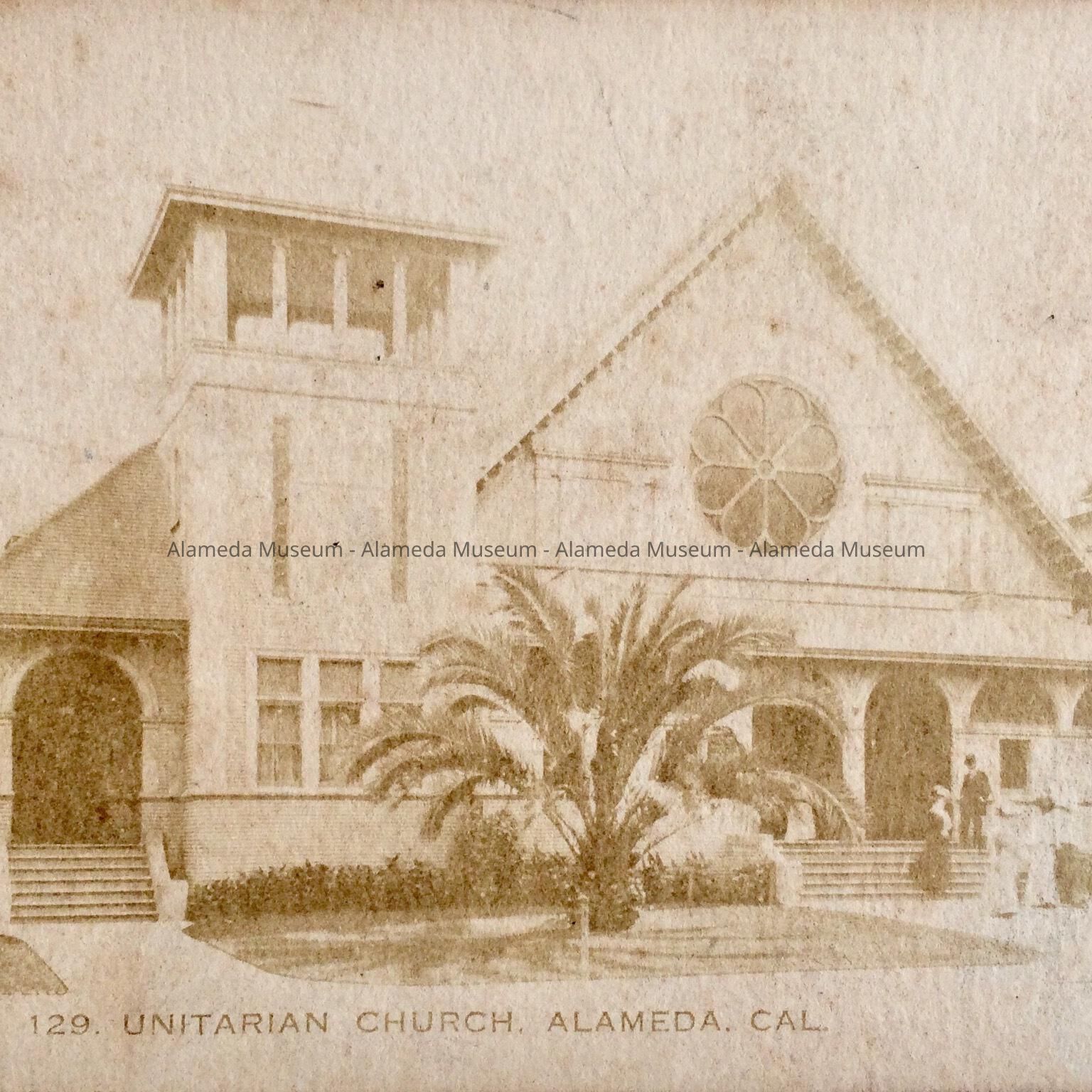 Description: Sepia tinted photographic postcard with printed caption "Unitarian Church, Alameda, Cal." Signed "Published by A. Blumberg, Alameda, Cal."
