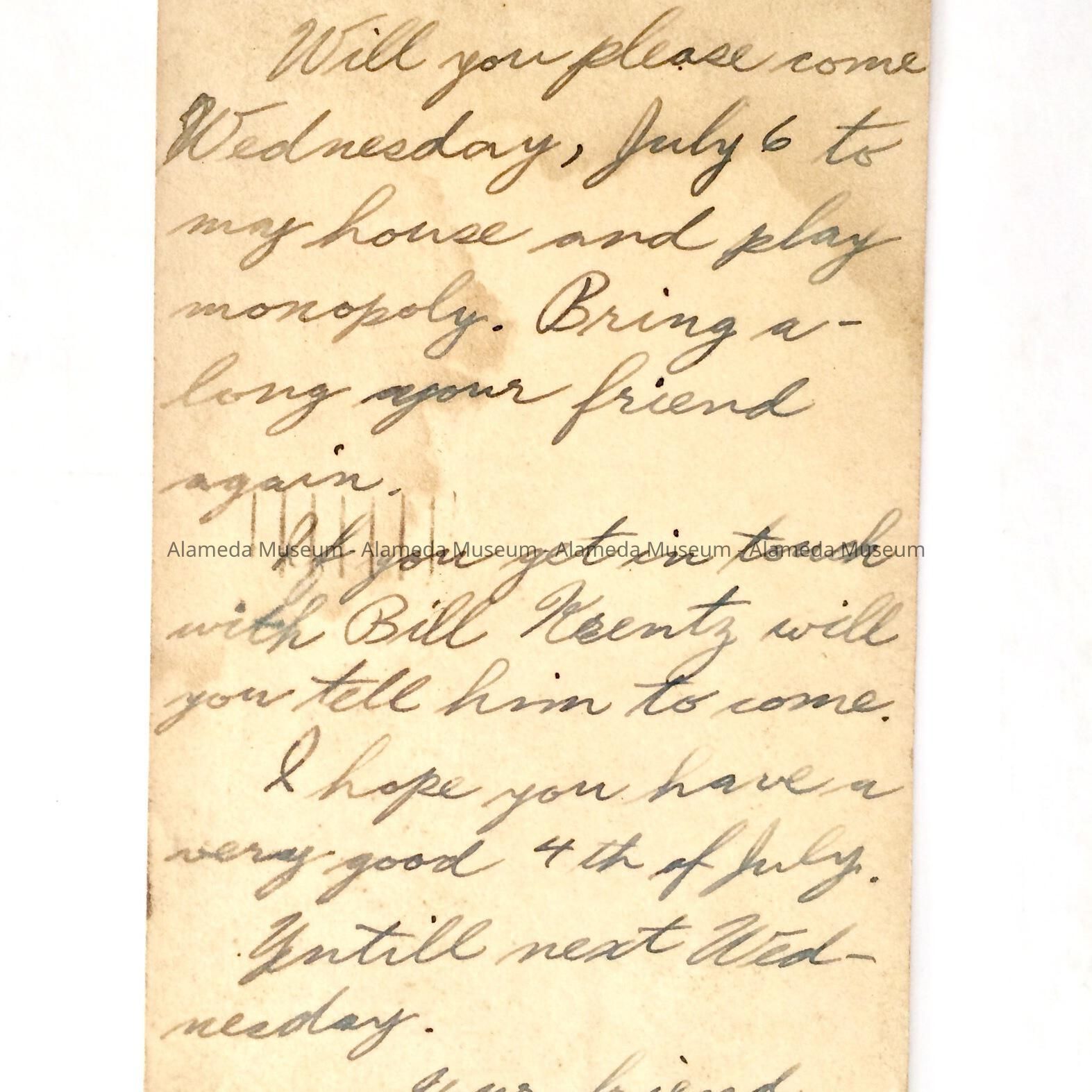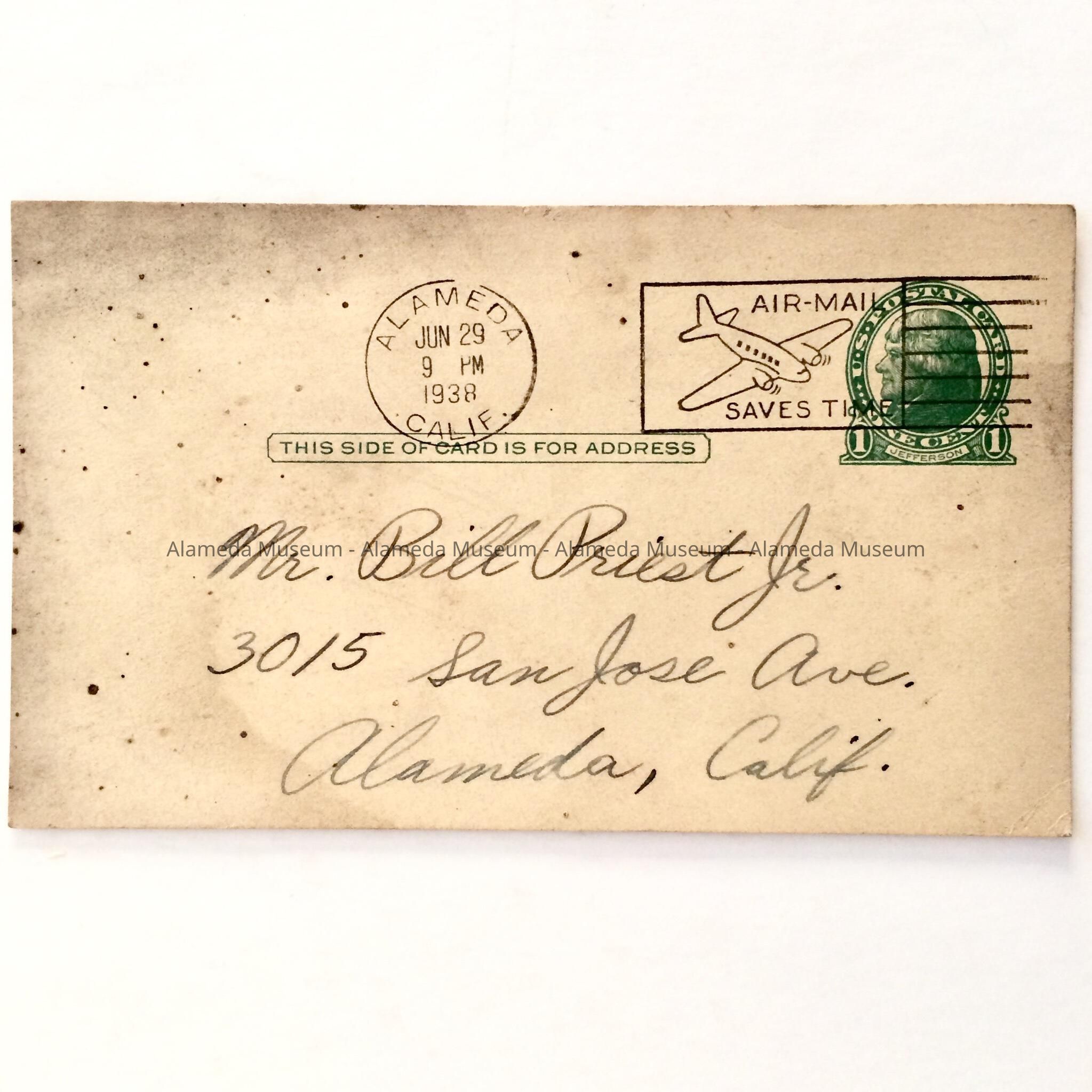 A POSTCARD ADDRESSED TO WILLIAM PRIEST, JR, 3012 SAN JOSE AVENUE, ALAMEDA, INVITING HIM TO A FRIEND'S HOME.