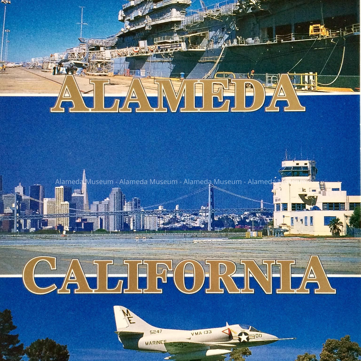 Description: Uncirculated color postcard featuring three photos, separated with gold-lettered captions 'Alameda' and 'California'. Top image is of a carrier, middle image of a white 2 story building with tower of 1 additional story, with Skyline of San Francisco and Bay Bridge behind; bottom image is of an airplane on a triangular blue pylon on a lawn, with white buildings beyond. Published by Smith Novelty Company, San Francisco.