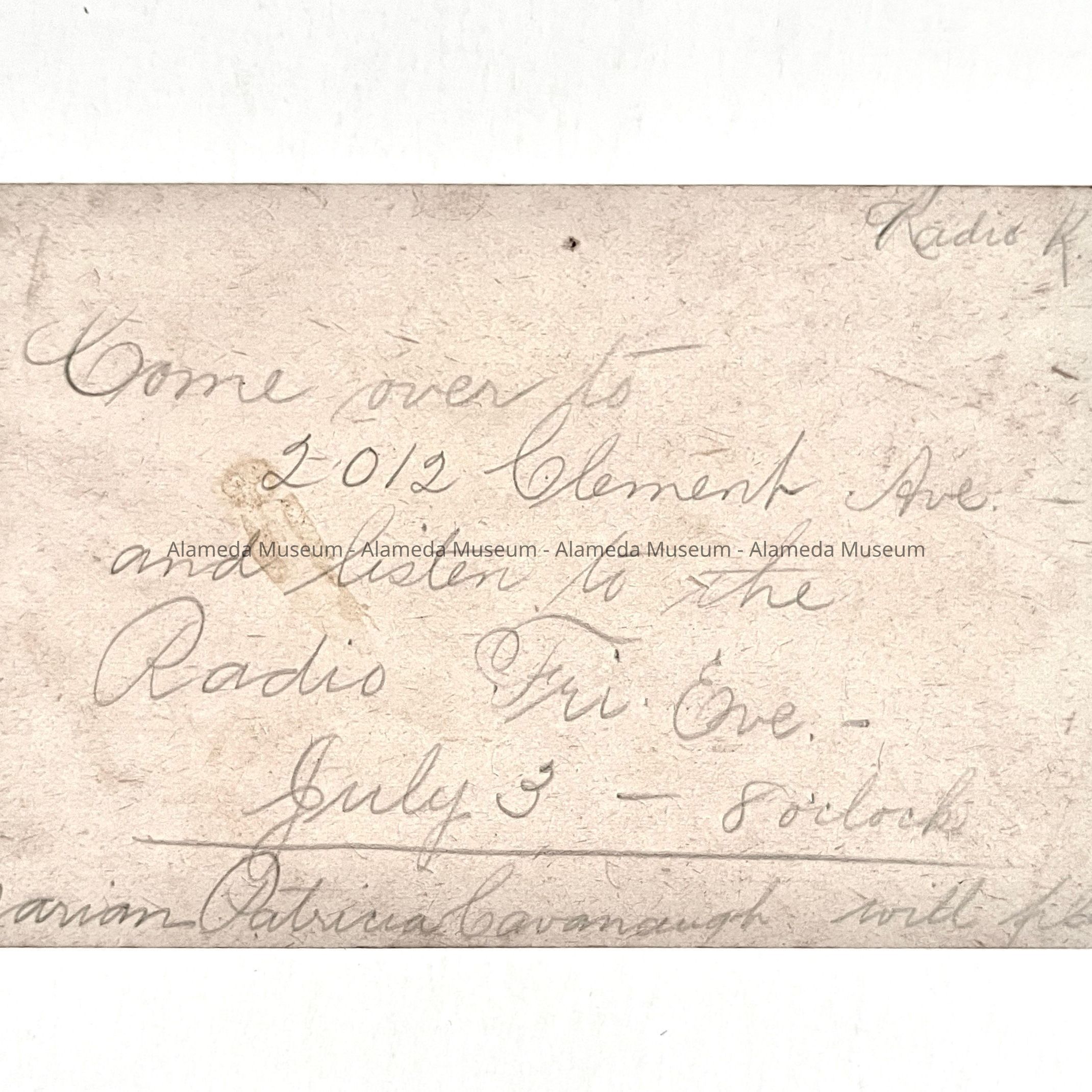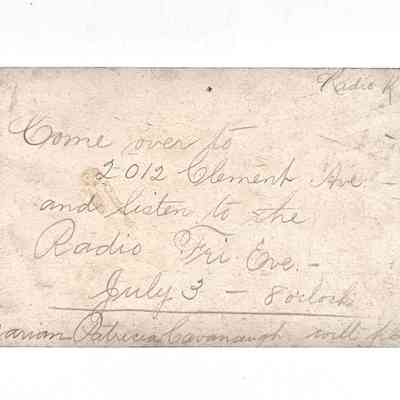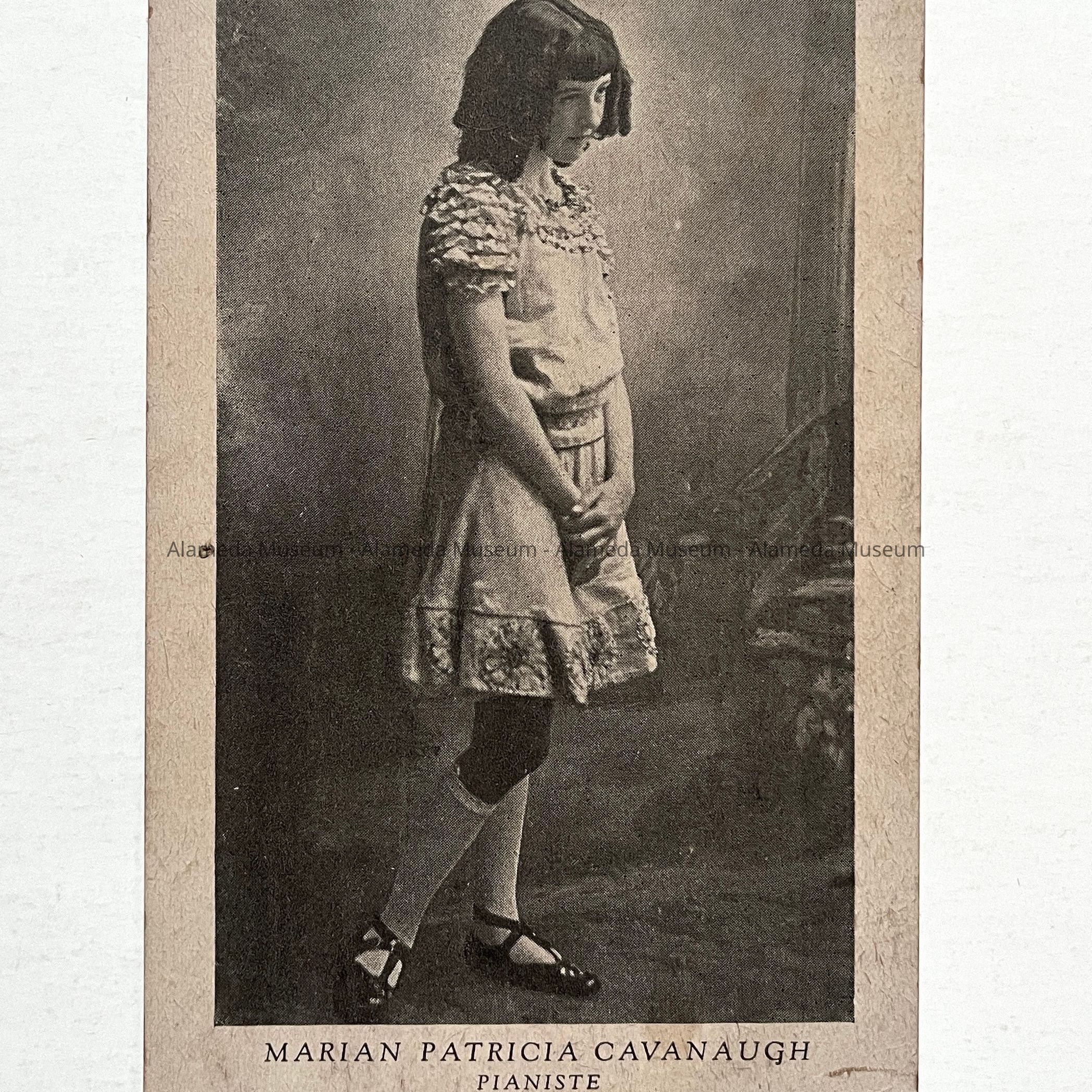History of Object: Postcards used as advertisements for the piano prodigy Marion Patricia Cavanaugh. Her family resided at 2012 Clement Avenue and were neighbors of the Edw. A. Meyers (Myers) family at 2005 Clement Avenue. Patricia's career was cut short by a serious auto accident a few years later.