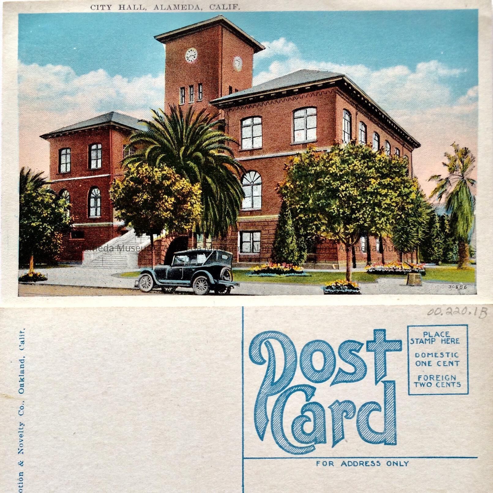 HISTORY OF OBJECTS: POSTCARDS DEPICTING MAIN FACADE, ALAMEDA CITY HALL; UPPER SECTION OF TOWER REMOVED AND KRUSI CLOCK INSTALLED.