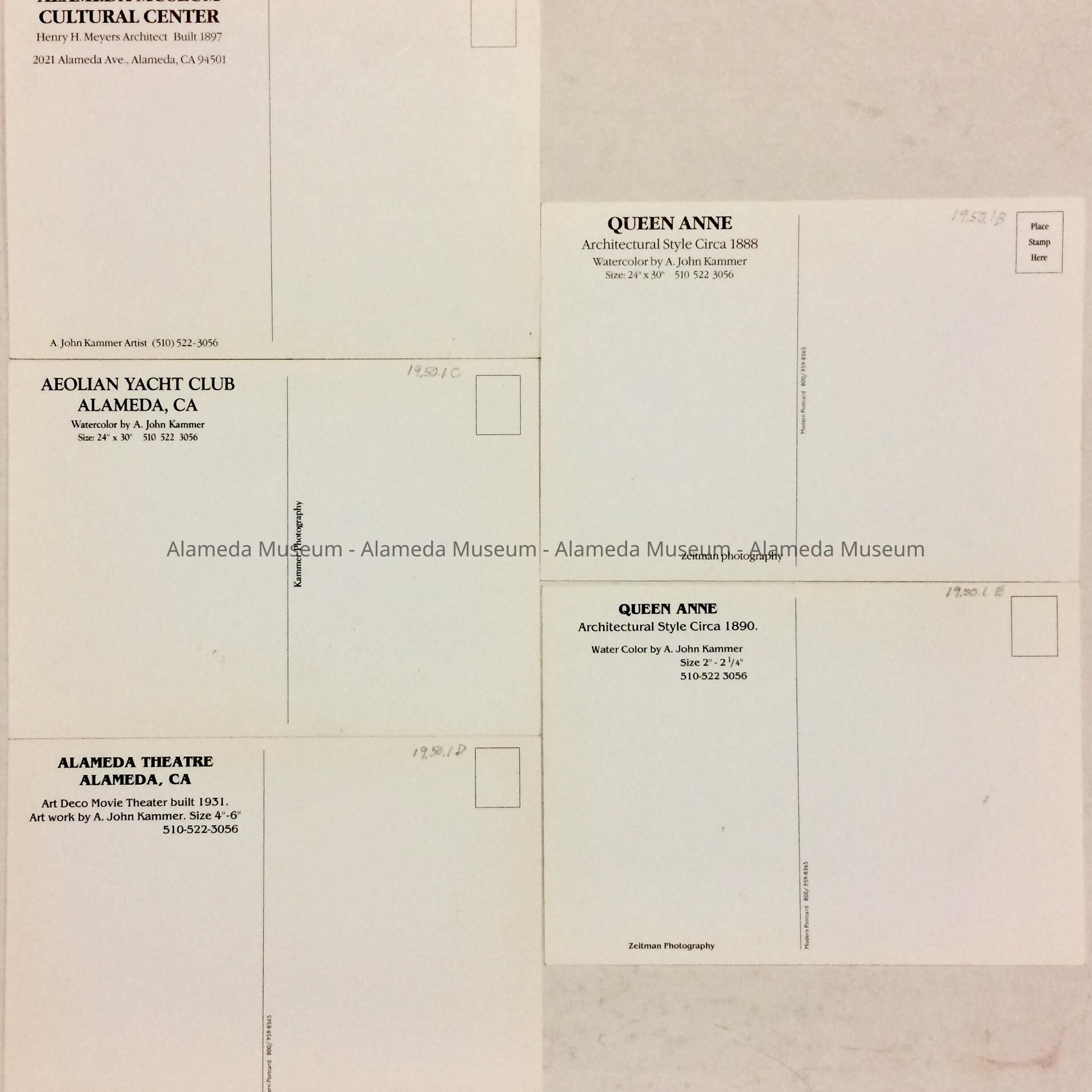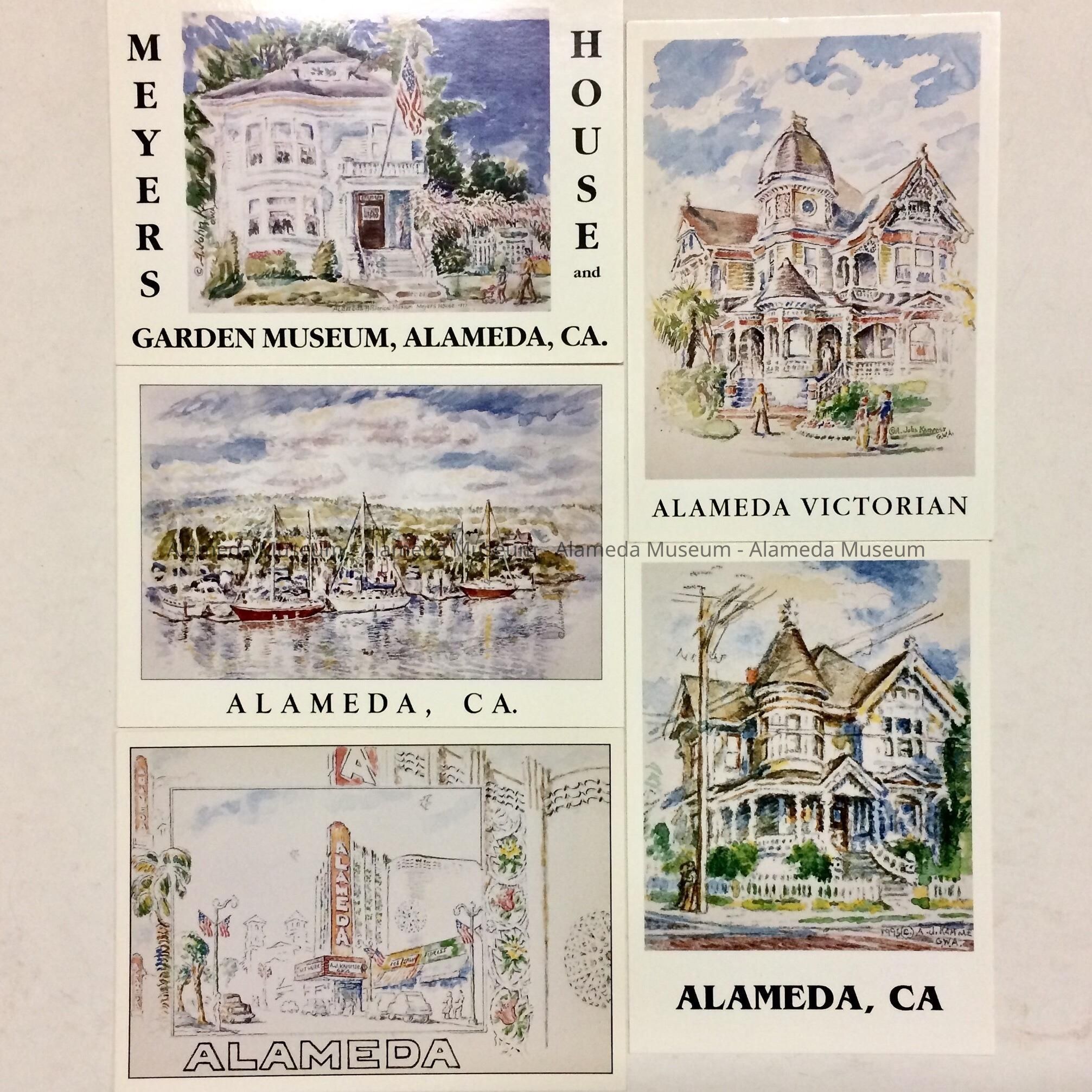 Description: Modern postcards replicating paintings of Victorian-style homes and other structures in Alameda. Cards are signed “Zeitman Photgraphy".