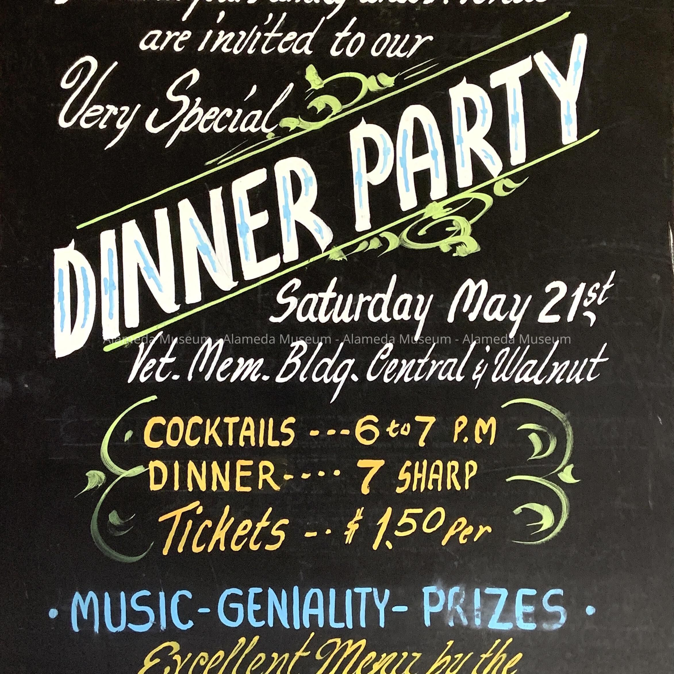 HISTORY OF OBJECT: A POSTER ADVERTISING A DINNER PARTY ON BEHALF OF THE ALAMEDA BARRACKS NO. 635, WW- I VETERANS. PARTY WAS SCHEDULED AT THE VETERANS MEMORIAL BUILDING LOCATED ON CENTRAL AVENUE AT THE CORNER OF WALNUT STREET. ADMISSION: $1.50 PER TICKET.