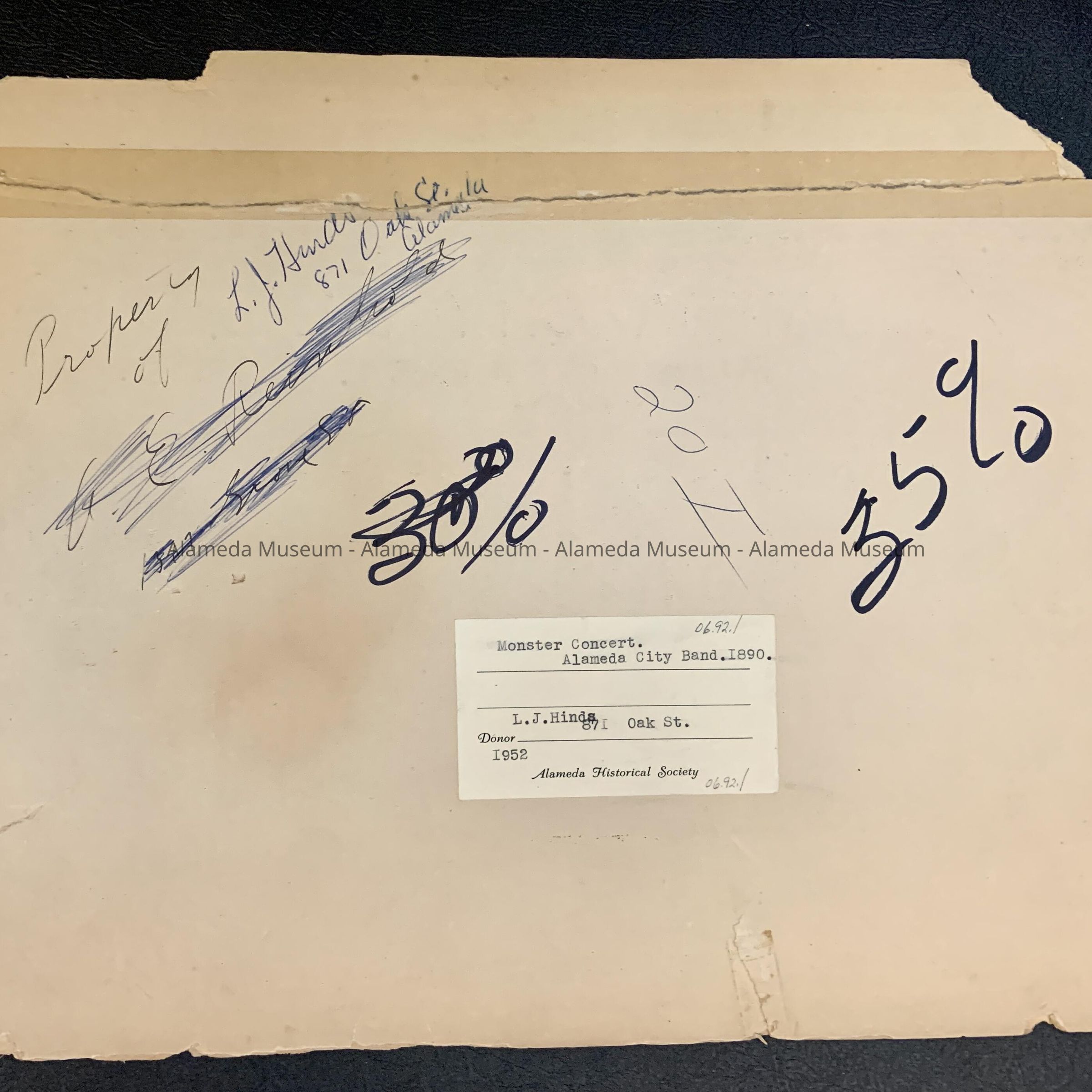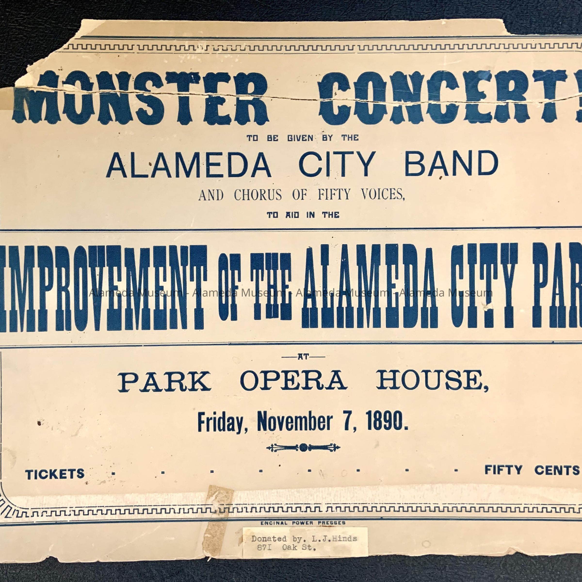 HISTORY OF OBJECT: A POSTER ADVERTISING A MONSTER CONCERT TO BE PRESENTED BY THE ALAMEDA CITY BAND AND CHORUS OF 50 VOICES TO AID IN THE IMPROVEMENT OF THE ALAMEDA CITY PARK. CONCERT WAS SCHEDULED FOR FRIDAY, NOVEMBER 7, 1890 AT THE PARK OPERA HOUSE. LOCATION IS MOST LIKELY JACKSON PARK (BAND STAND, ETC).