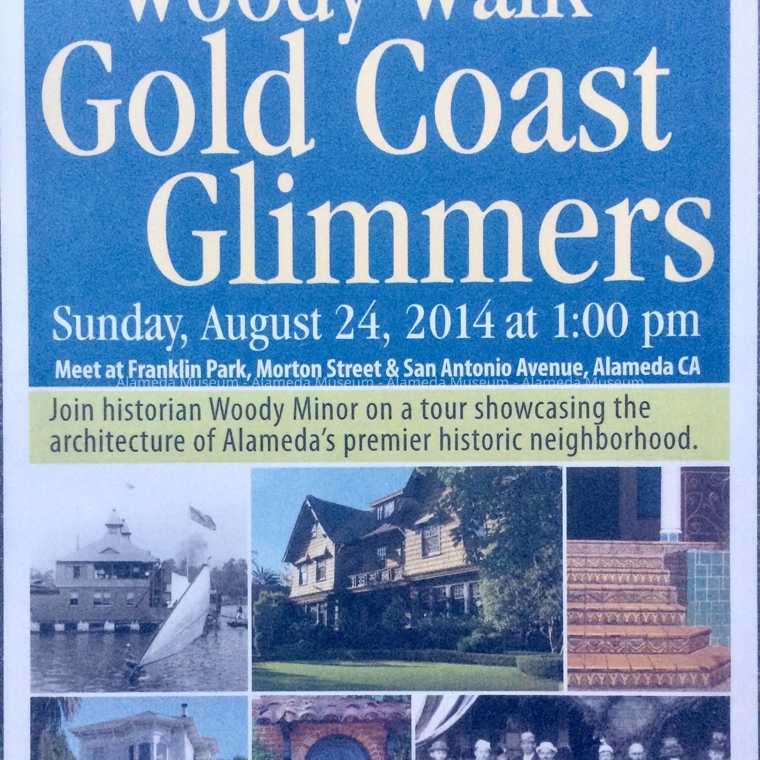 Poster with caption: Alameda Architectural Preservation Society presents Woody Walk - Gold Coast Glimmers. Poster has 2 photos of houses, one of steps embellished with decorative tile, and two reproduced old photos, one of the old Encinal Yacht Club, and one of a group of people.