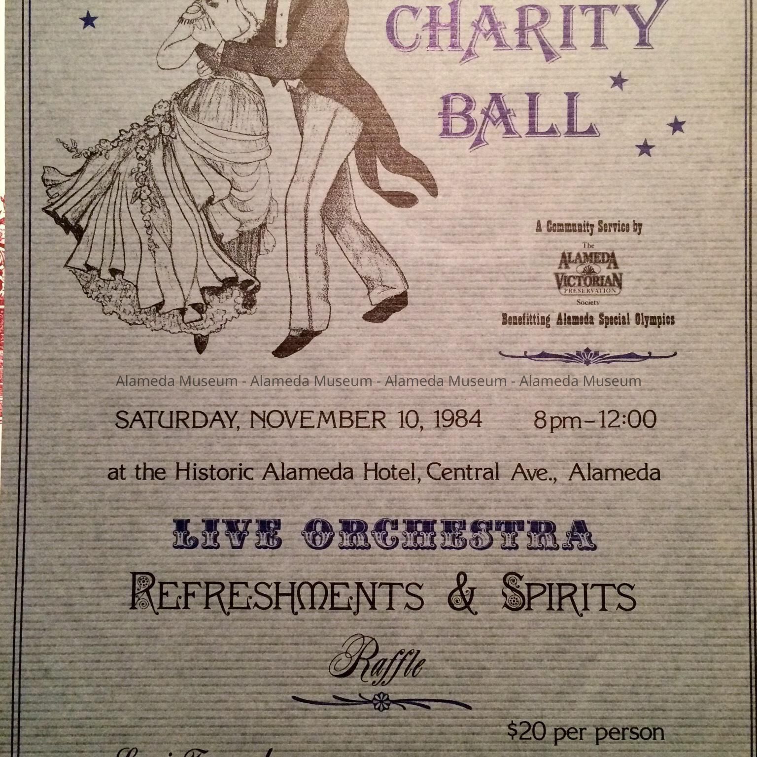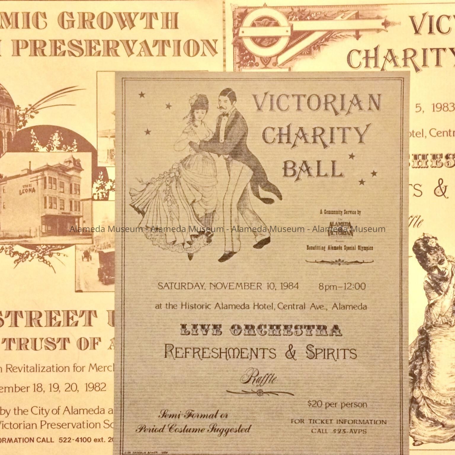 Posters for events organized the Alameda Victorian Preservation Society. A: Main Street conference on Downtown Revitalization for Merchants & Landowners; B & C: Ball.