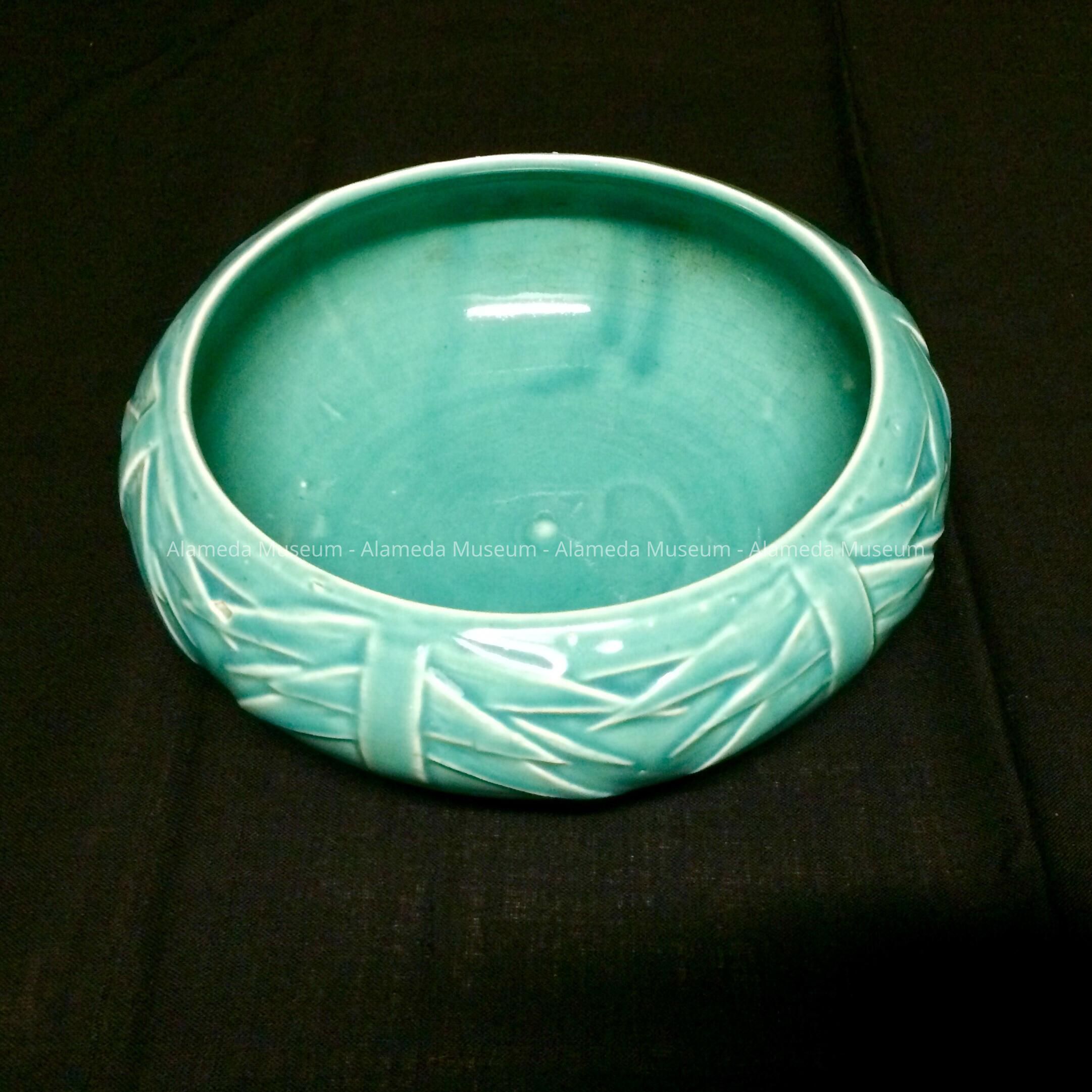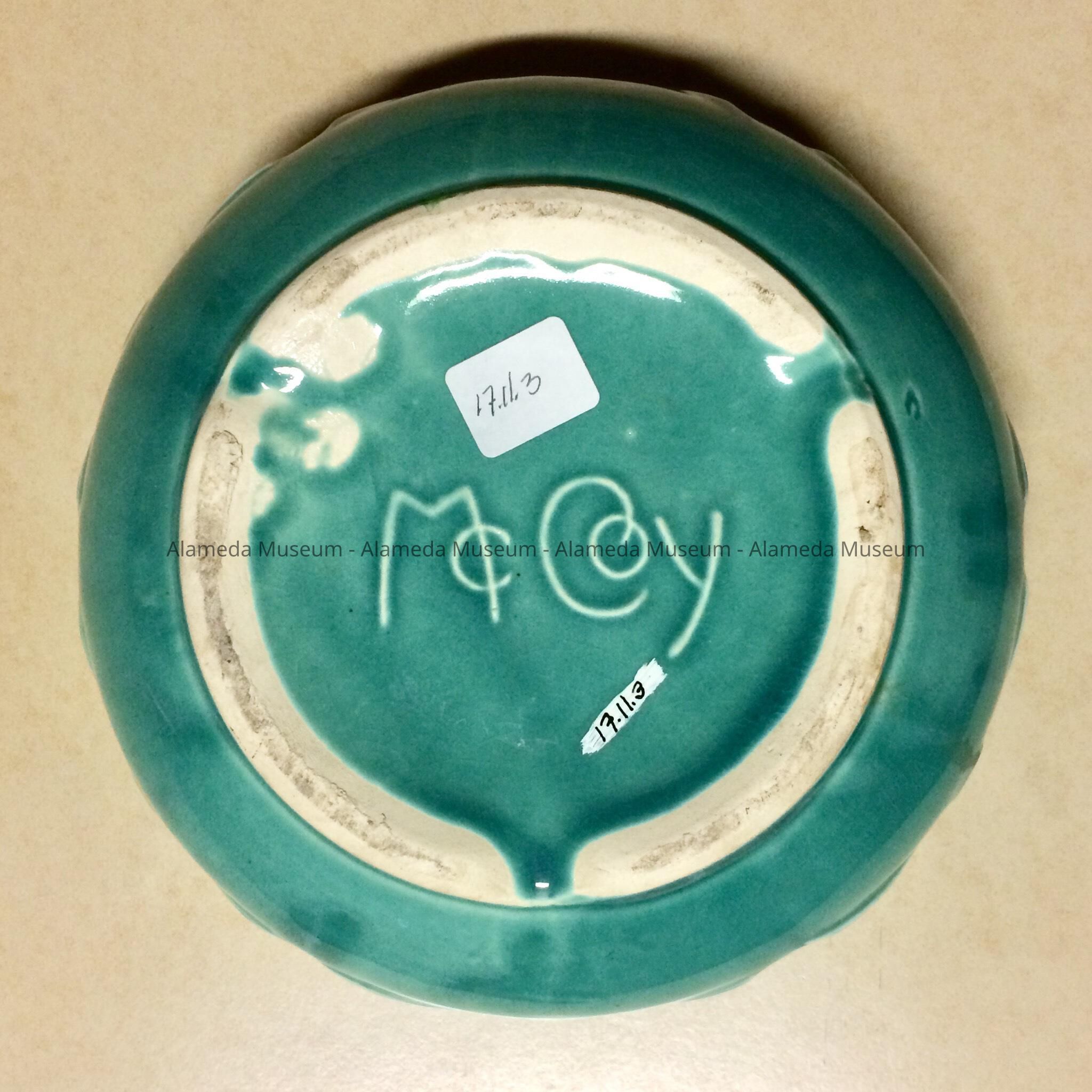 Description: A circular-shaped pottery bowl with an inverted rim. The exterior has a high glaze and its base is signed in the mold, “McCoy.”