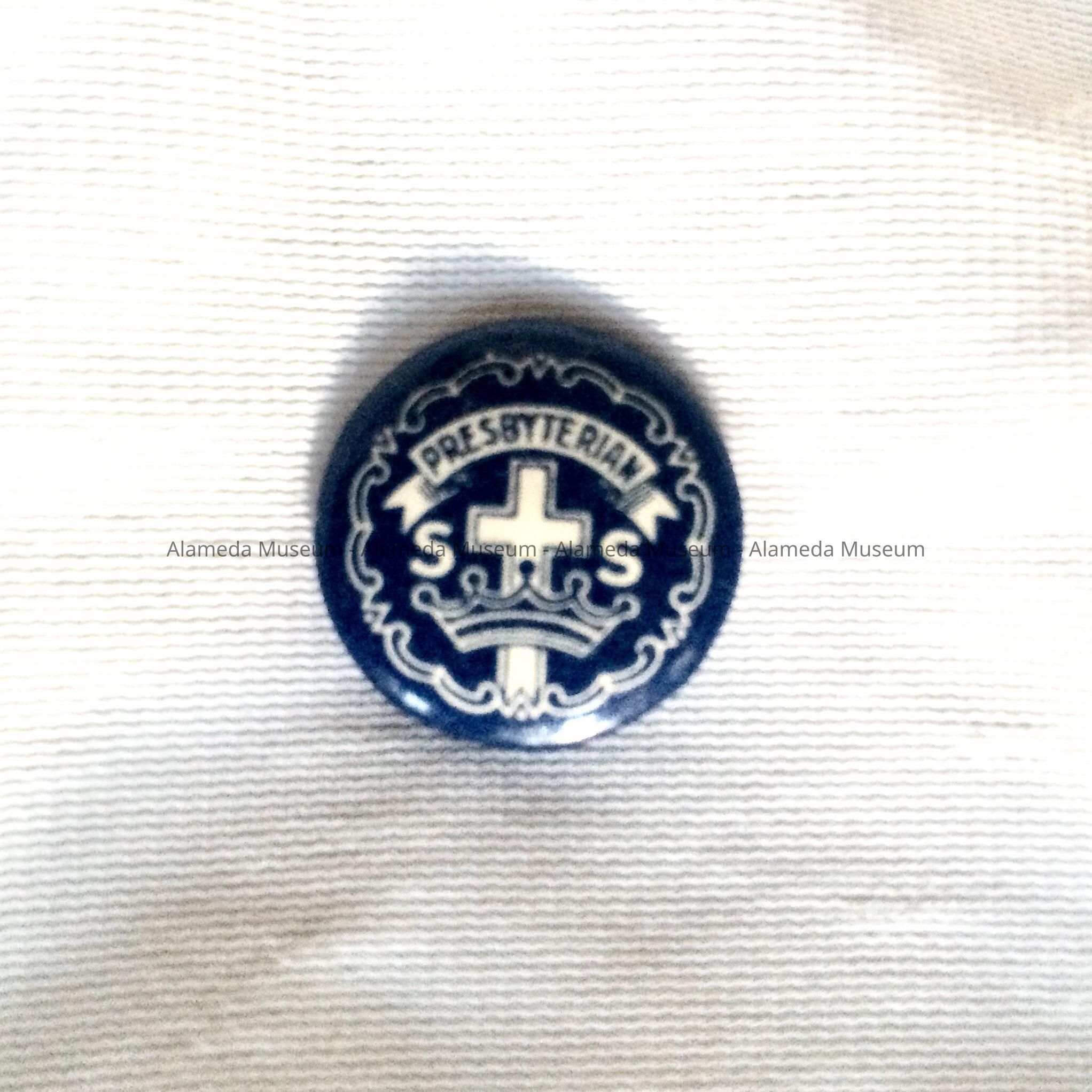 History of Object: pin of the Presbyterian Church Sunday School, manufactured by Bastian Brothers of New York. The Martin family were members of the community of the First Presbyterian Church on Santa Clara.