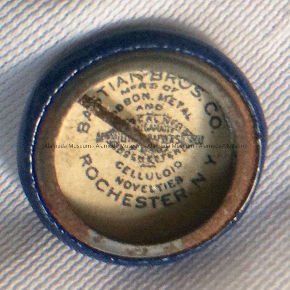 Description: button pin with celluloid over a design in white on navy blue background, stating 'Presbyterian' and S S, featuring a crown in front of a cross. Verso has pin stub, and underneath, paper stating Bastian Bros. Co, Rochester N.Y.