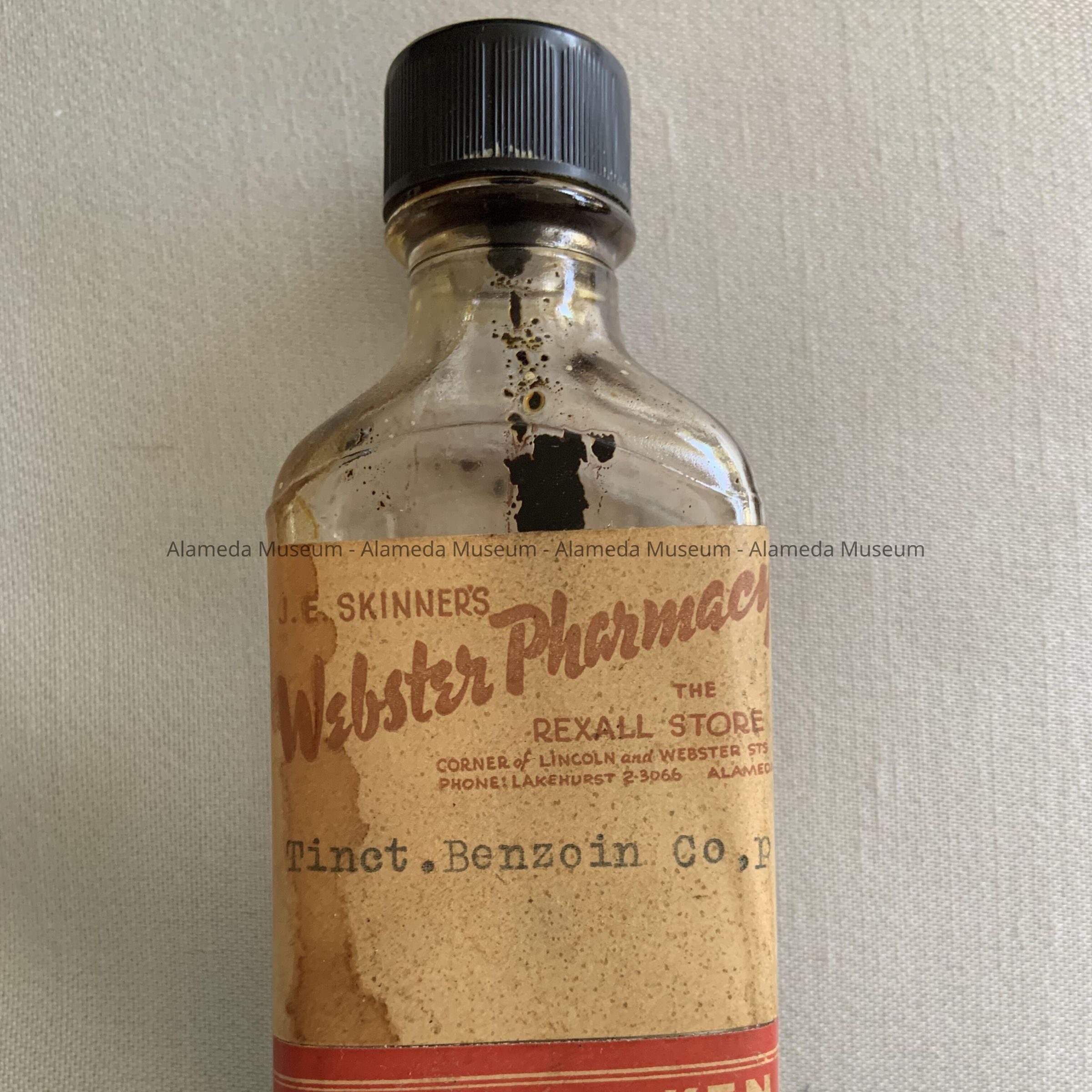 Prescription medicine bottle purchased at J. E. Skinner's Webster Pharmacy, corner Lincoln & Webster Street, Alameda, phone LA 2-3066. Bottle found at 1625 San Antonio Avenue.