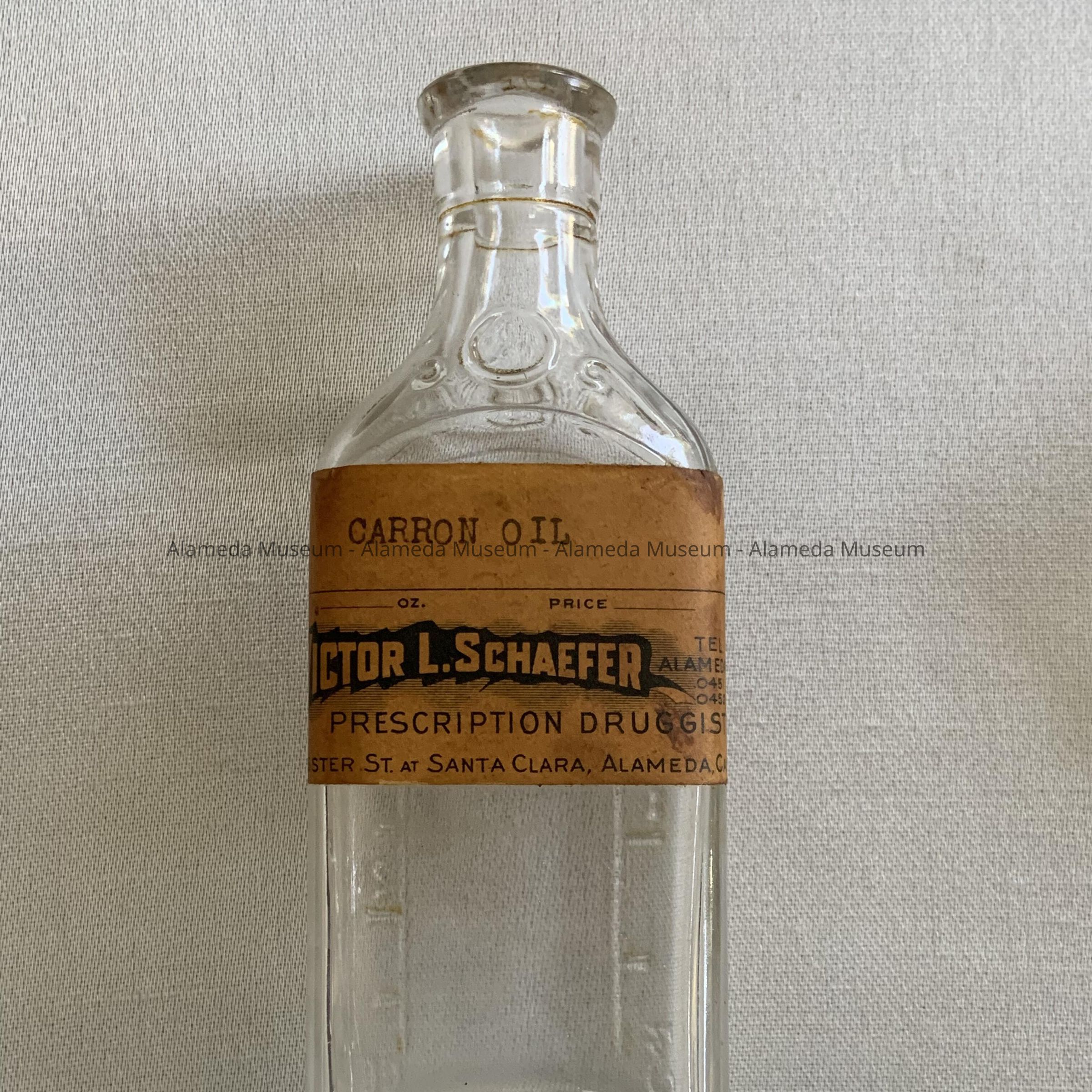 History of Object: Prescription medicine bottle purchased at Victor L. Schaefer's prescription drug store, Webster Street, at Santa Clara, Alameda, Cal. Tel. Alameda 0451-0452. Bottle found at 403 Santa Clara Avenue.