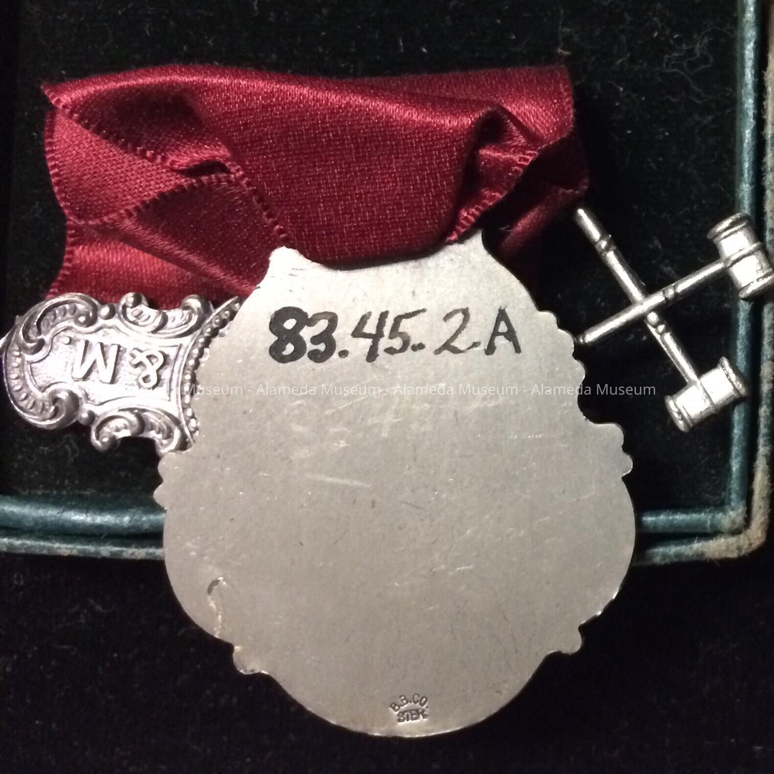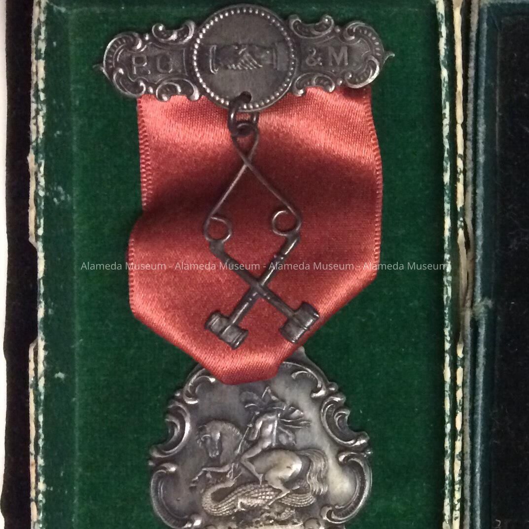 History of Object: President's medal, Alameda Branch, Order of the Daughters of St. George. The Alameda Lodge, Golden Poppy 249, was founded here in 1922, and closed in 1976.