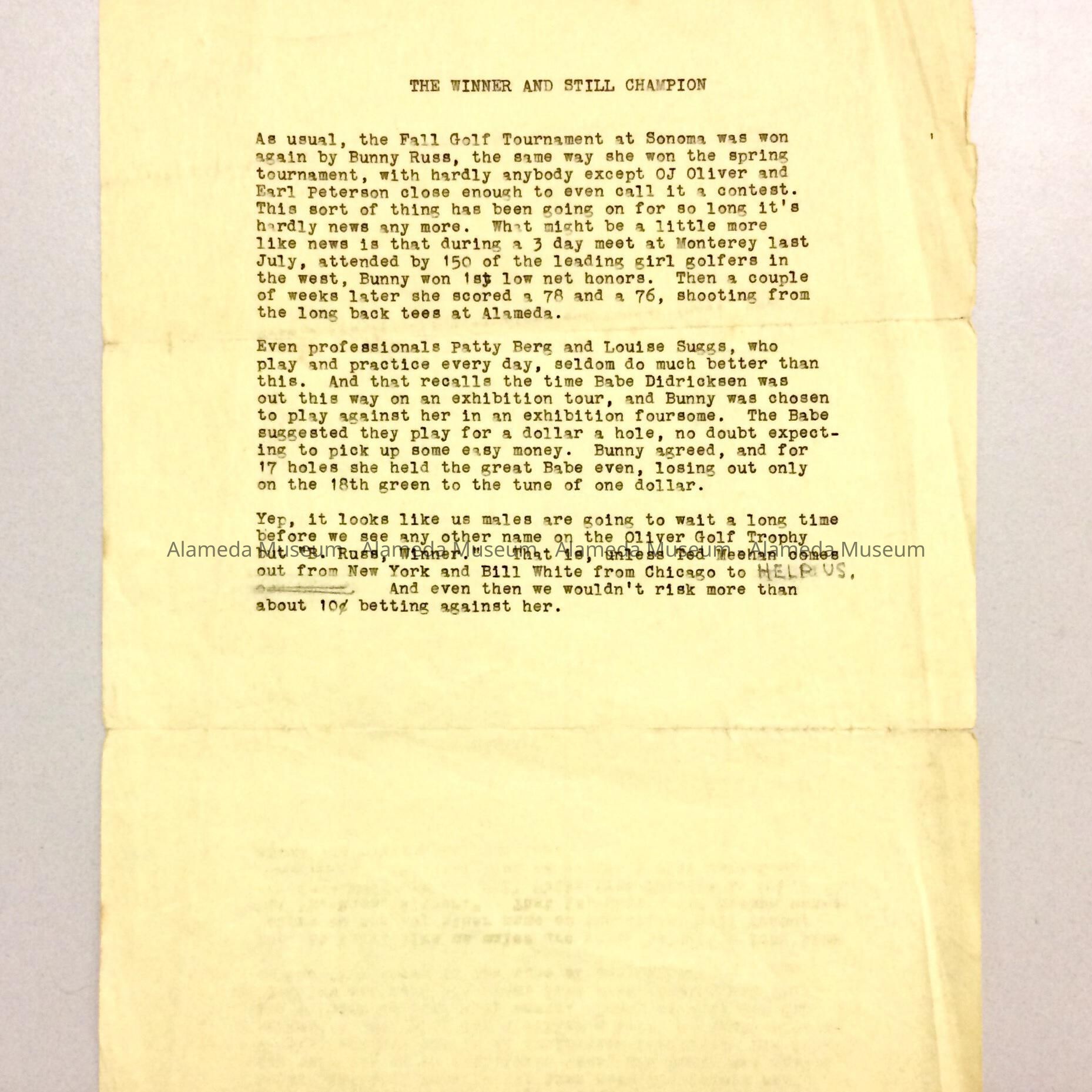 Press Release about Bunny Fergus Russ winning a golf tournament, prior 2011Entry/Object ID