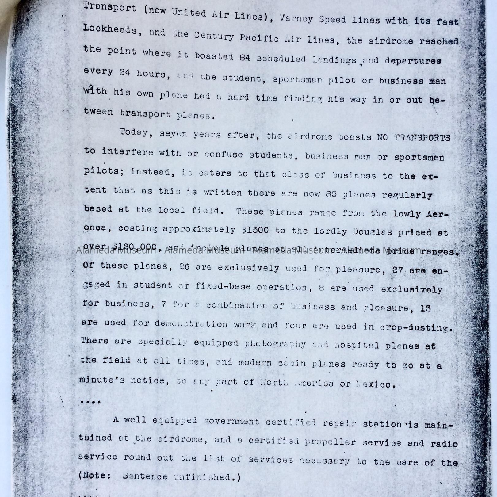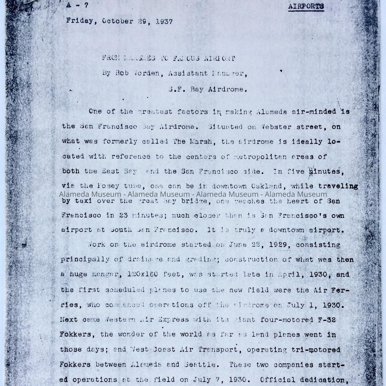History: Press release dated October 29, 1937 written by Bob Worden, Assistant Manager of the San Francisco Bay Airdrome, concerning the airport which site is now occupied by Alameda College.
