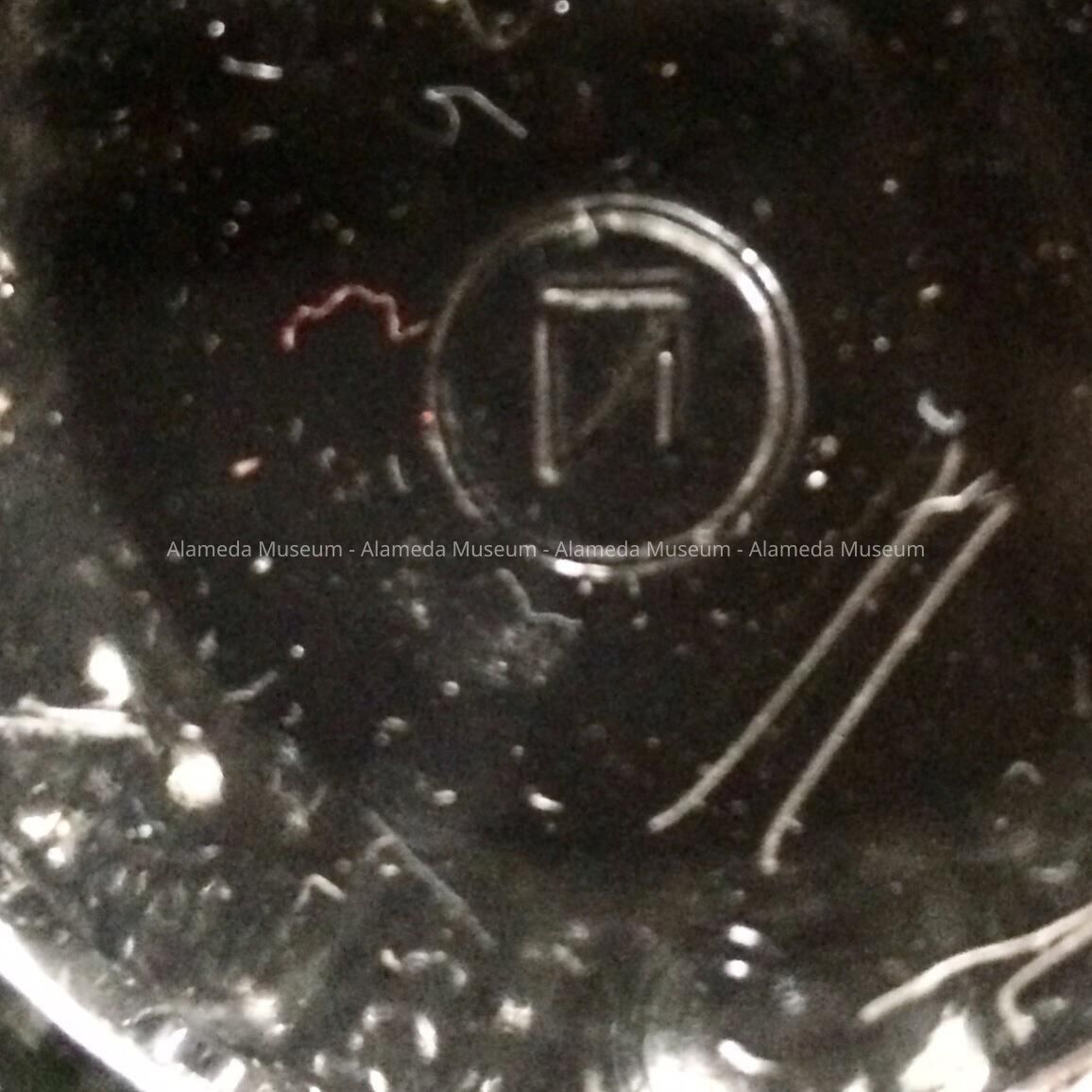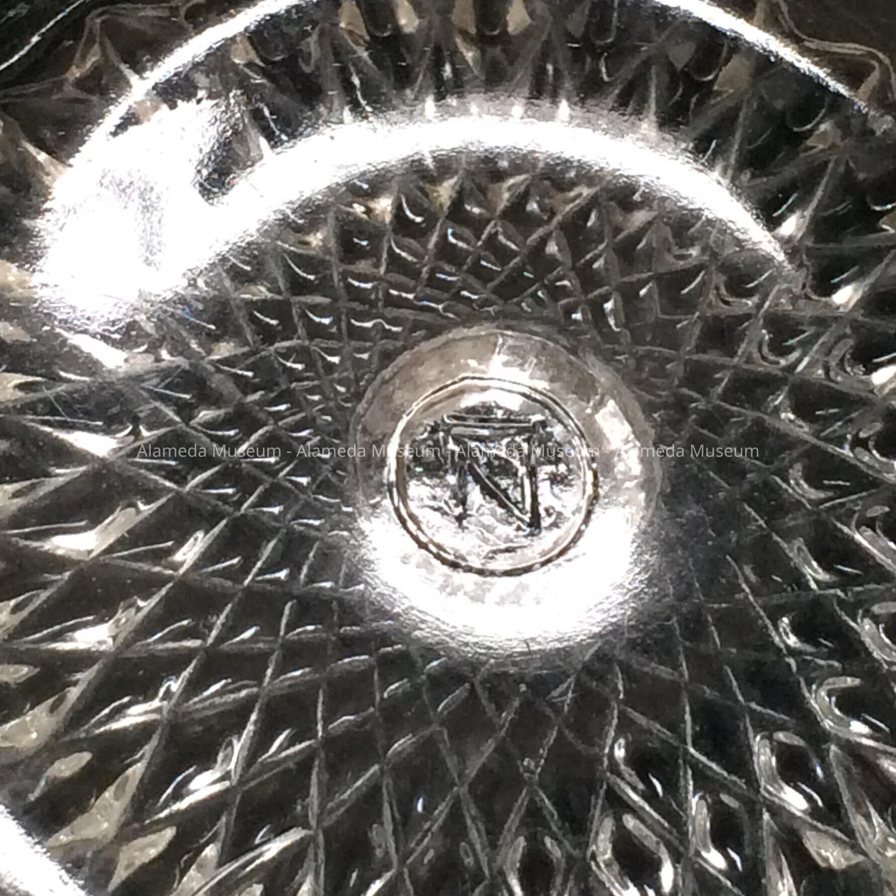 Description: A pedestal-base American-made clear deeply pressed glass punch bowl and four matching cups. The bowl is elevated by a pedestal base that is removable. All six pieces are signed with a circular mark within which is the capital letter "N", representing the maker, Northwood.