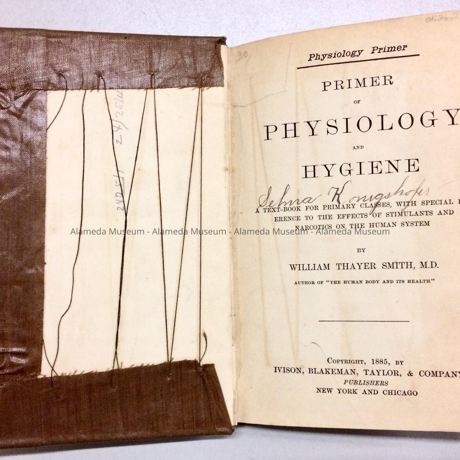 Description: Book, hard-bound, with crude brown colored fabric cover, entitled: Primer of Physiology and Hygiene, by Wm. Smith, MD. Ivison, Blakeman, Taylor & Co., NY. 1885.