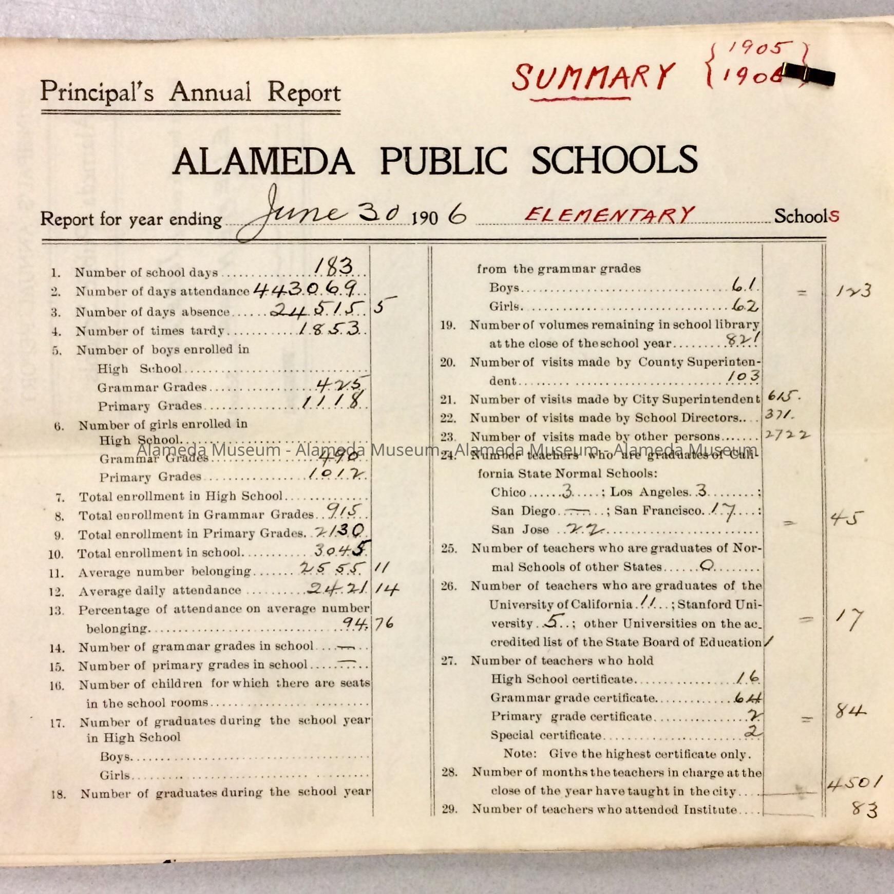 Principal's Annual Report, Alameda Public Schools, 1906Entry/Object ID