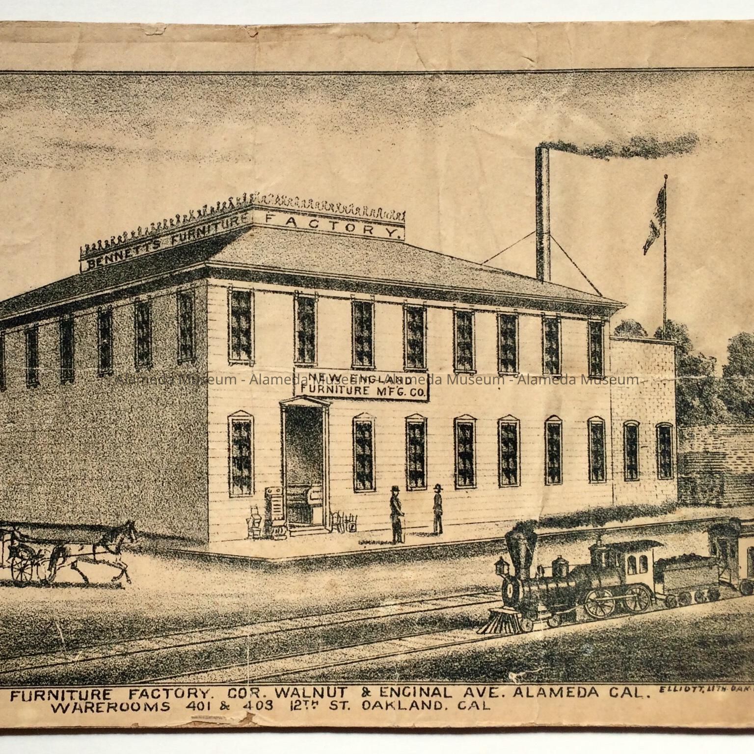 History of Object: This print appears to have been cut out of a newspaper or a county atlas of the 19th century. This print depicts the H.S. Bennett Furniture Factory at the corner of Walnut & Encinal Avenue, Alameda, California. Warerooms 401 & 103 12th Street, Oakland, California. It was destroyed by fire in 1888.