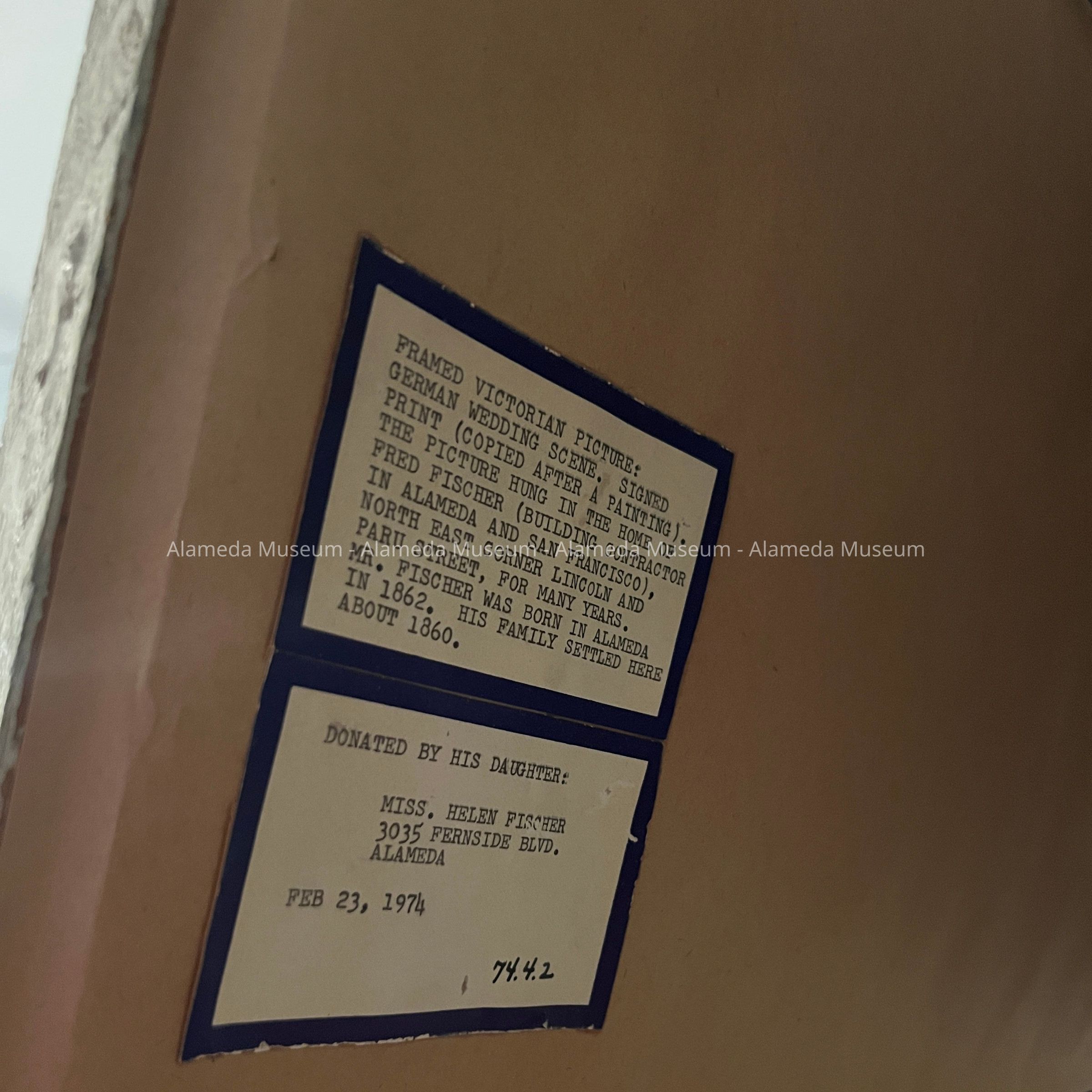 HISTORY OF OBJECT: VICTORIAN PICTURE, GERMAN WEDDING SCENE (SIGNED PRINT), COPIED AFTER A PAINTING. THE PICTURE HUNG IN THE HOME OF FRED FISCHER, BUILDING CONTRACTOR, ALAMEDA AND SAN FRANCISCO, NORTH EAST CORNER OF LINCOLN AND PARU STREET, FOR MANY YEARS. MR. FISCHER WAS BORN IN ALAMEDA IN 1862. THE FAMILY SETTLED IN ALAMEDA ABOUT 1860?