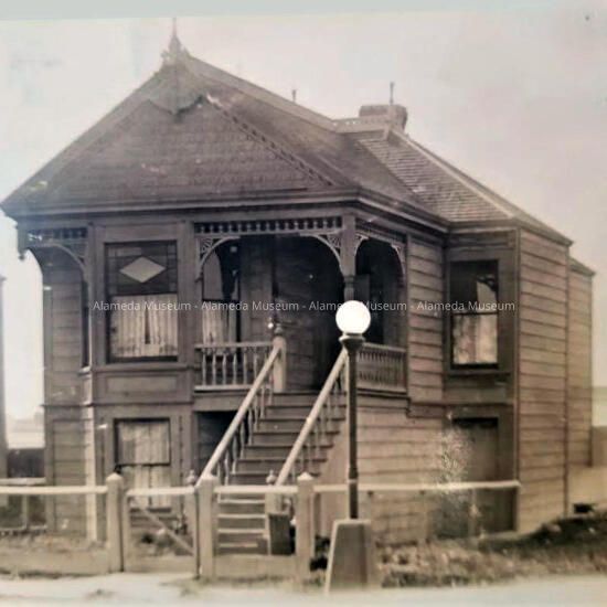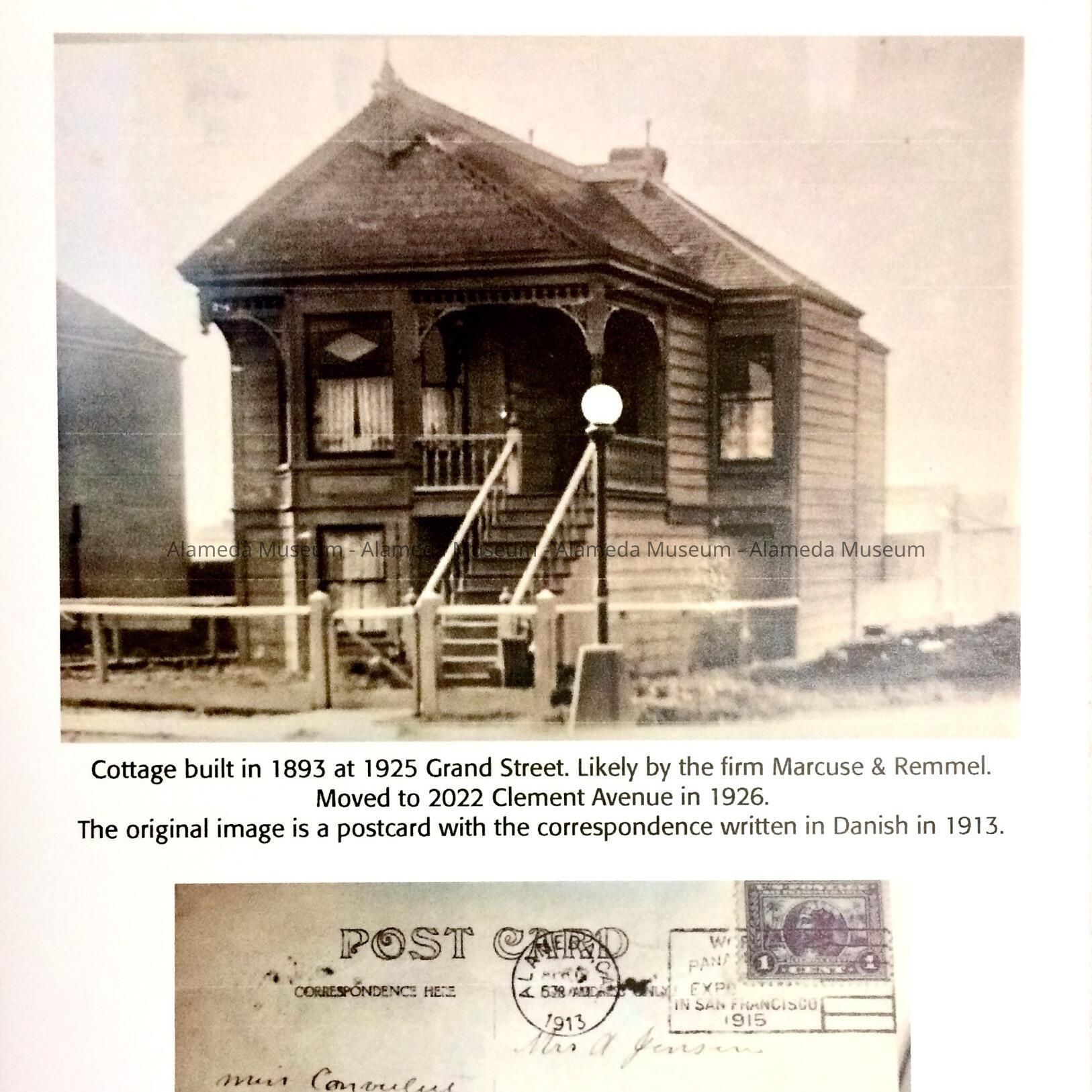 History of Object: Postcard of a High Basement Cottage built in 1893 on Grand Street, attributed to the firm of Marcuse & Remmel. William Pullson, his wife Antoinette and their son William lived at 1925 Grand in 1910. He was a sailor in the dredging industry. They were from Norway. The building was moved to 2022 Clement Avenue in 1925, to make place for the Alameda Belt Line railroad.