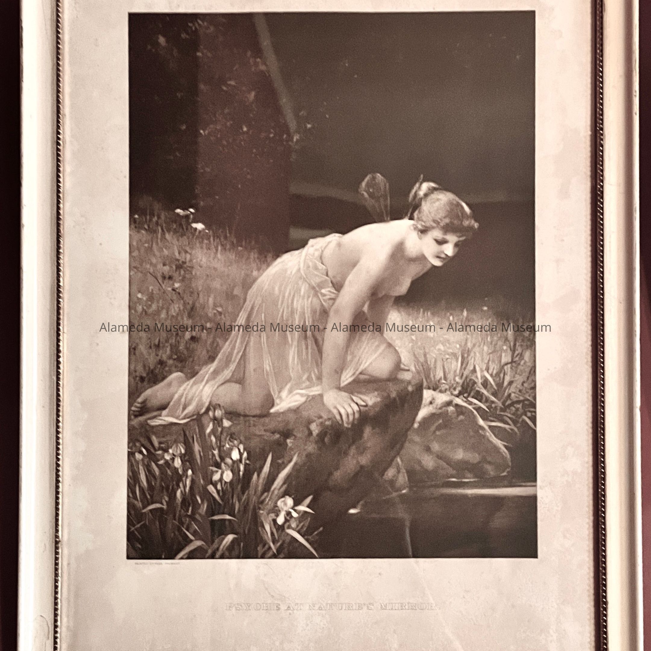 Description: Art print (sepia tinted engraving) entitled "Psyche at Nature's Mirror," painted by Paul Thumann. Original gesso on wood frame, ivory finish (paint) with beading (gilt) as an inner border.
