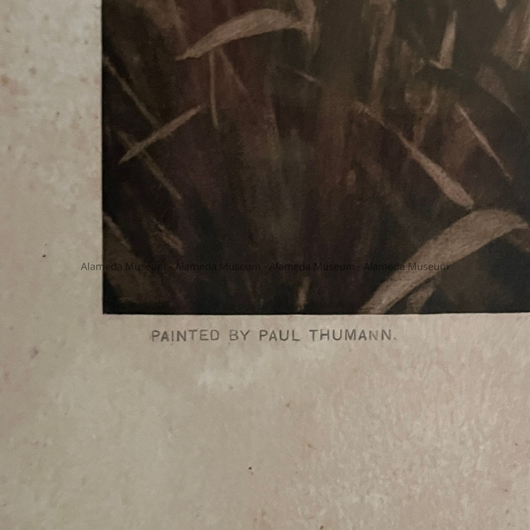 History of Object: Art print which hung in the home of Wm. Theodore Eisfeldt, 1722 Buena Vista Avenue. Mr. Eisfeldt was a musician (viola & oboe) and arranger. Originally from Germany, born in Anhalt, Ballenstadt, Dec. 13, 1834, he came to California in 1852. He served in the Civil War, a member of the First California Volunteers. In 1867 he settled in San Francisco and became one of the organizers of the Musicians Union No. 6. In 1892 he built a home at 1722 Buena Vista Avenue which he occupied until his death in