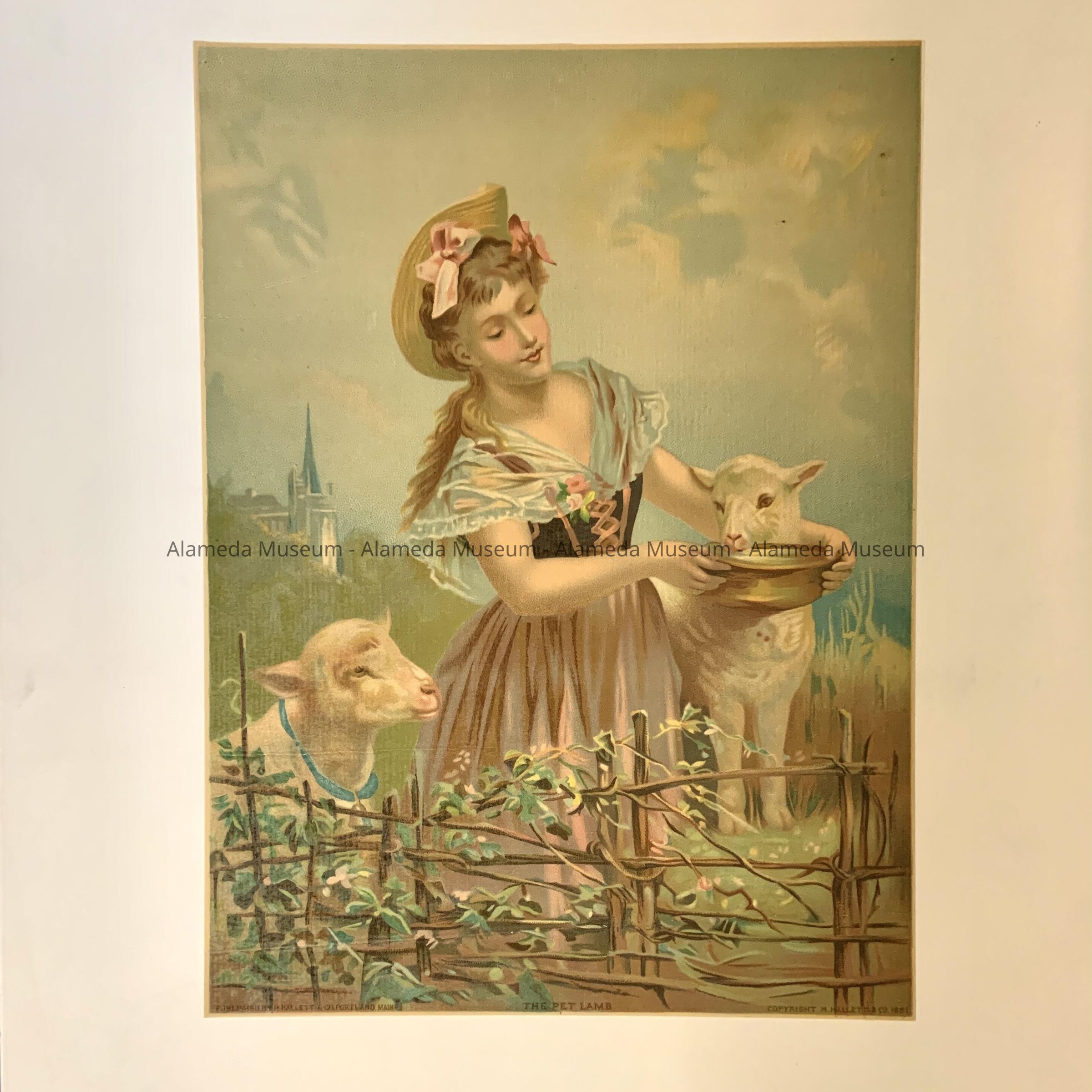 DESCRIPTION: A CHROMOLITHOGRAPHIC PRINT IN COLOR DEPICTING TWO SHEPHERDESSES TITLED, "PAT LAMB ," AND COPYRIGHTED BY H. HALLETT & CO., 1881. THE PRINT HAS BEEN MOUNTED ON HEAVY STOCK PAPER FOR ITS PRESERVATION.