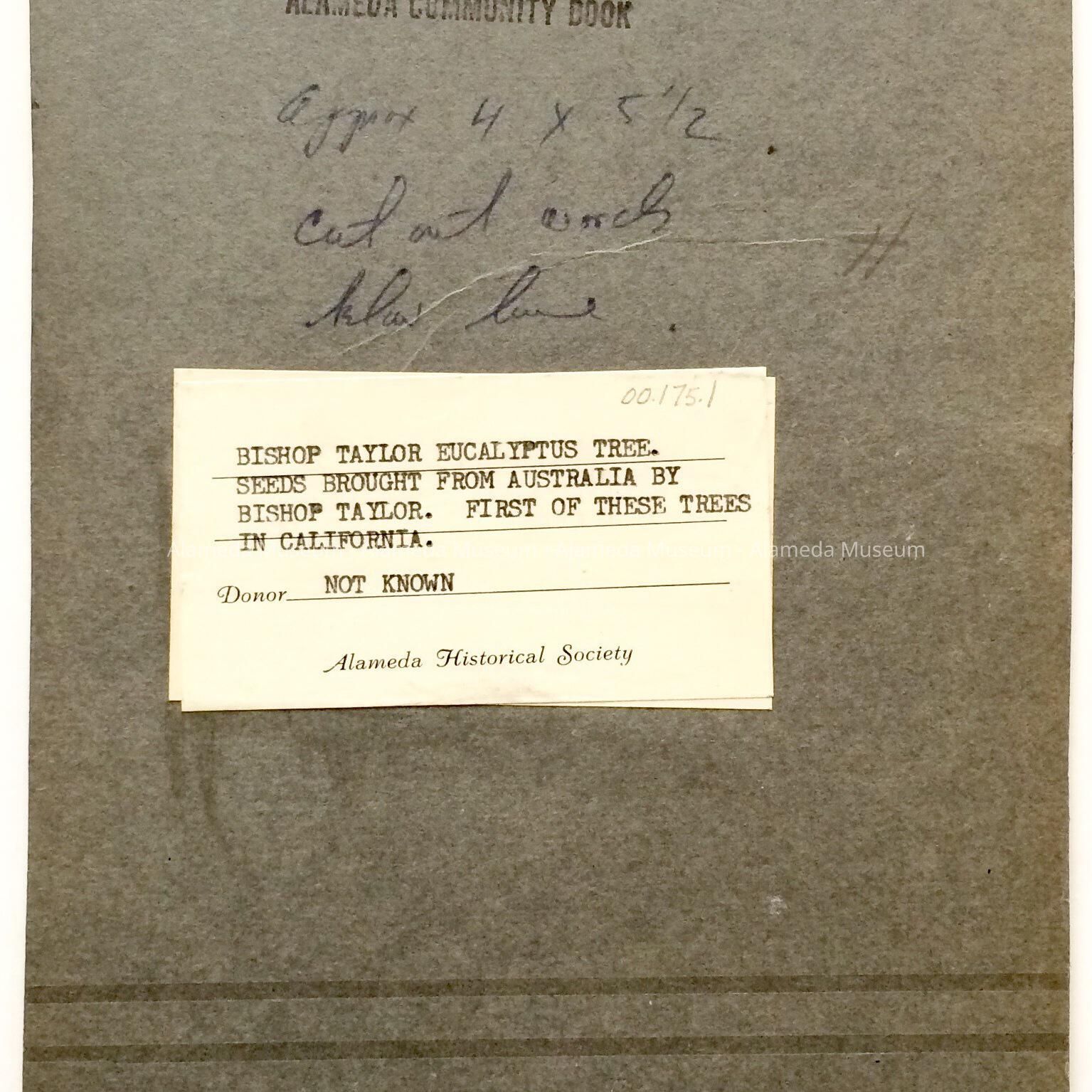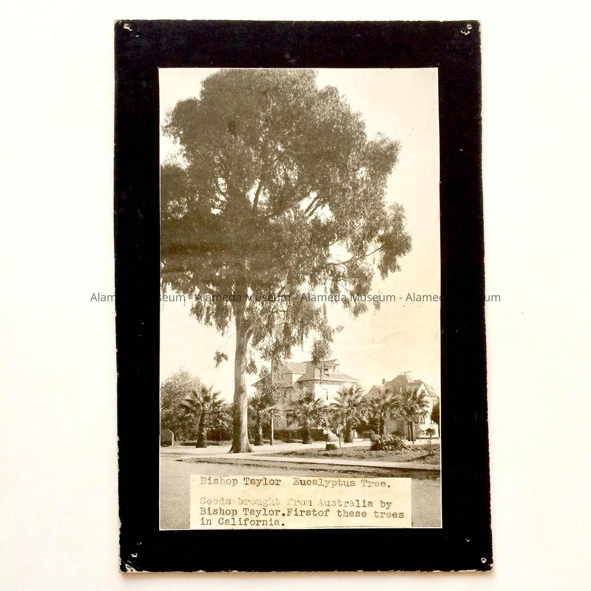 Photo-lithographic print taken from an early publication depicting the Taylor Eucalyptus tree, the seed of which was brought from Australia by Bishop William Taylor of the Methodist Church. The tree stood at the corner of Park Avenue and Central for many years. Given to the Alameda Historical Society prior to 1971 and never catalogued.