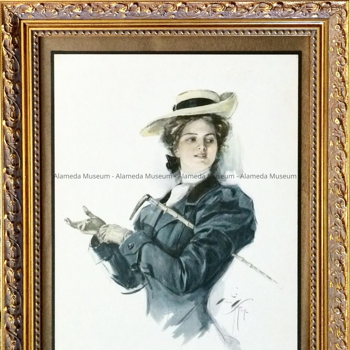 History of Object: A print after the noted illustrator Harrison Fisher (1877-1934) who came with his family to Alameda at age nine from New York. The family lived at 1713 Sherman St., and young Harrison attended local schools. In 1891 the family moved to 5 Mastick Court. In later years Harrison Fisher, under the auspices of Wm. Randolph Hearst, was sent to New York as a newspaper illustrator, and this event launched his career as a nationally known magazine cover artist and the subsequent creator of the "Harrison Fisher girl". He died in New York City in 1934, and is buried at Oakland's Mountain View Cemetery.