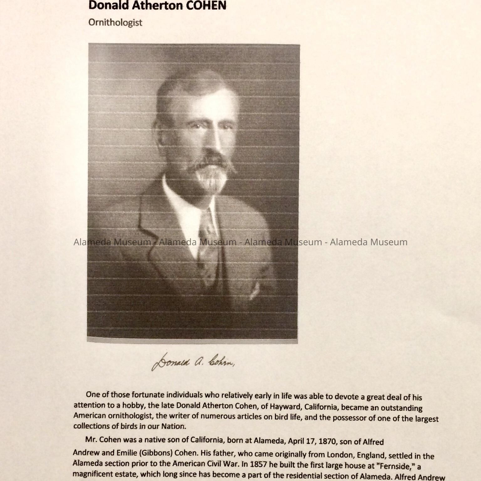 History: Print-out of a biographical sketch of Donald Atherton Cohen, from a version of the Encyclopedia of American Biography, New Series, published by: New York, American Historical Society, 1934-1970', made available on-line. This information, and the photo, was used by Valerie Turpen in her article in the Alameda Museum Quarterly for December 2017, Issue 4, 'Cohen Family Dinner Service Comes Home'.