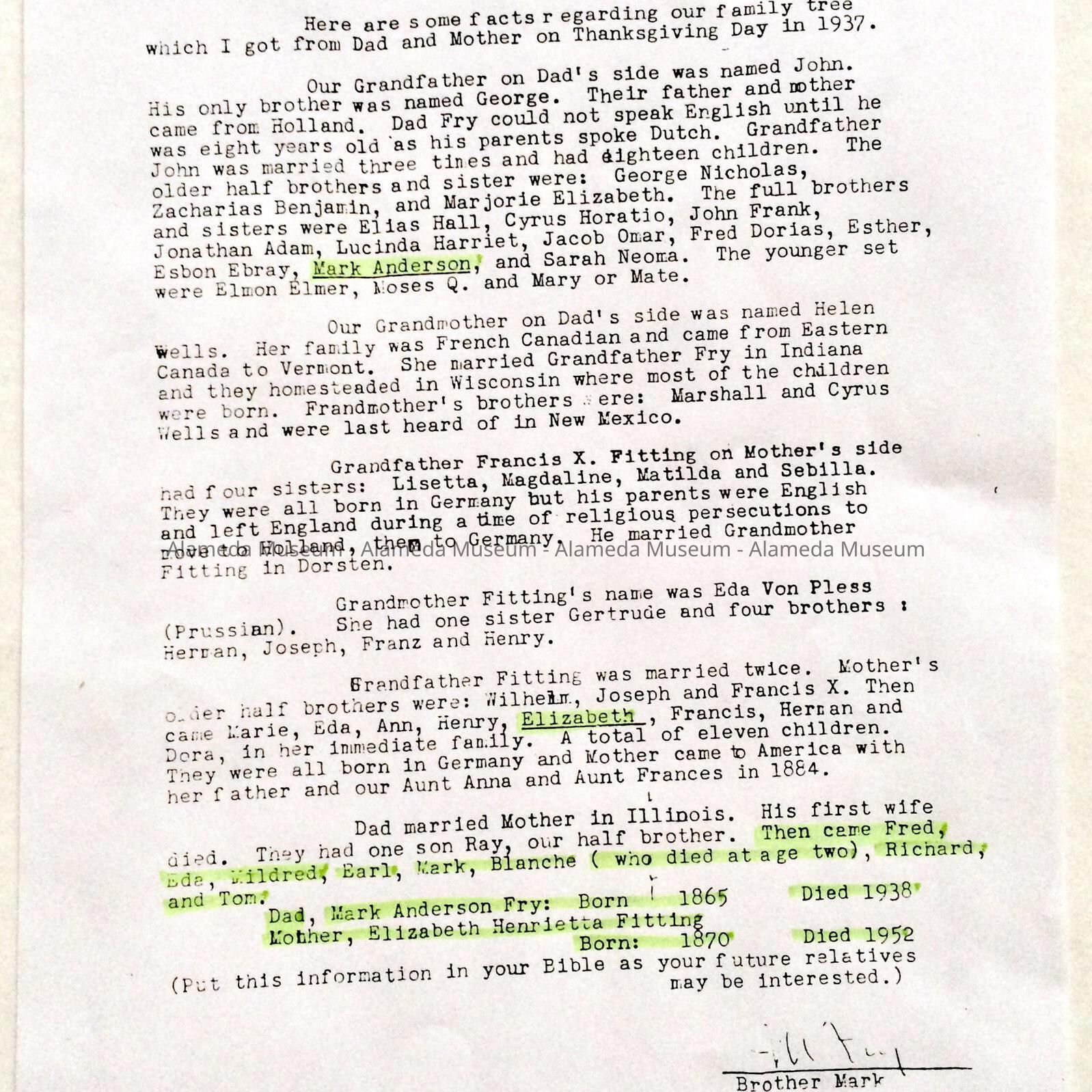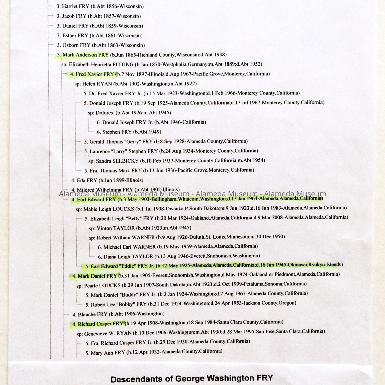 HISTORY OF OBJECT: A LISTING AND ACCOMPANYING LETTER FROM MARK FRY, BROTHER OF EARL FRY, ABOUT DESCENDANTS OF GEORGE WASHINGTON FRY, 1797-1867. EARL E. FRY WAS A DESCENDANT.