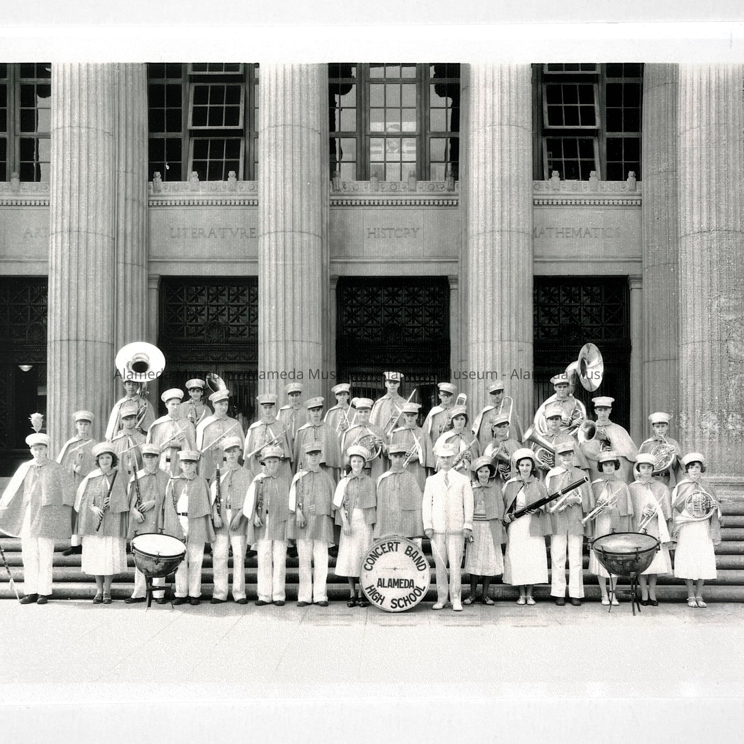 A PHOTOGRAPH DEPICTING THE CONCERT BAND OF ALAMEDA HIGH SCHOOL, STANDING AT THE MAIN ENTRANCE OF THE HIGH SCHOOL.