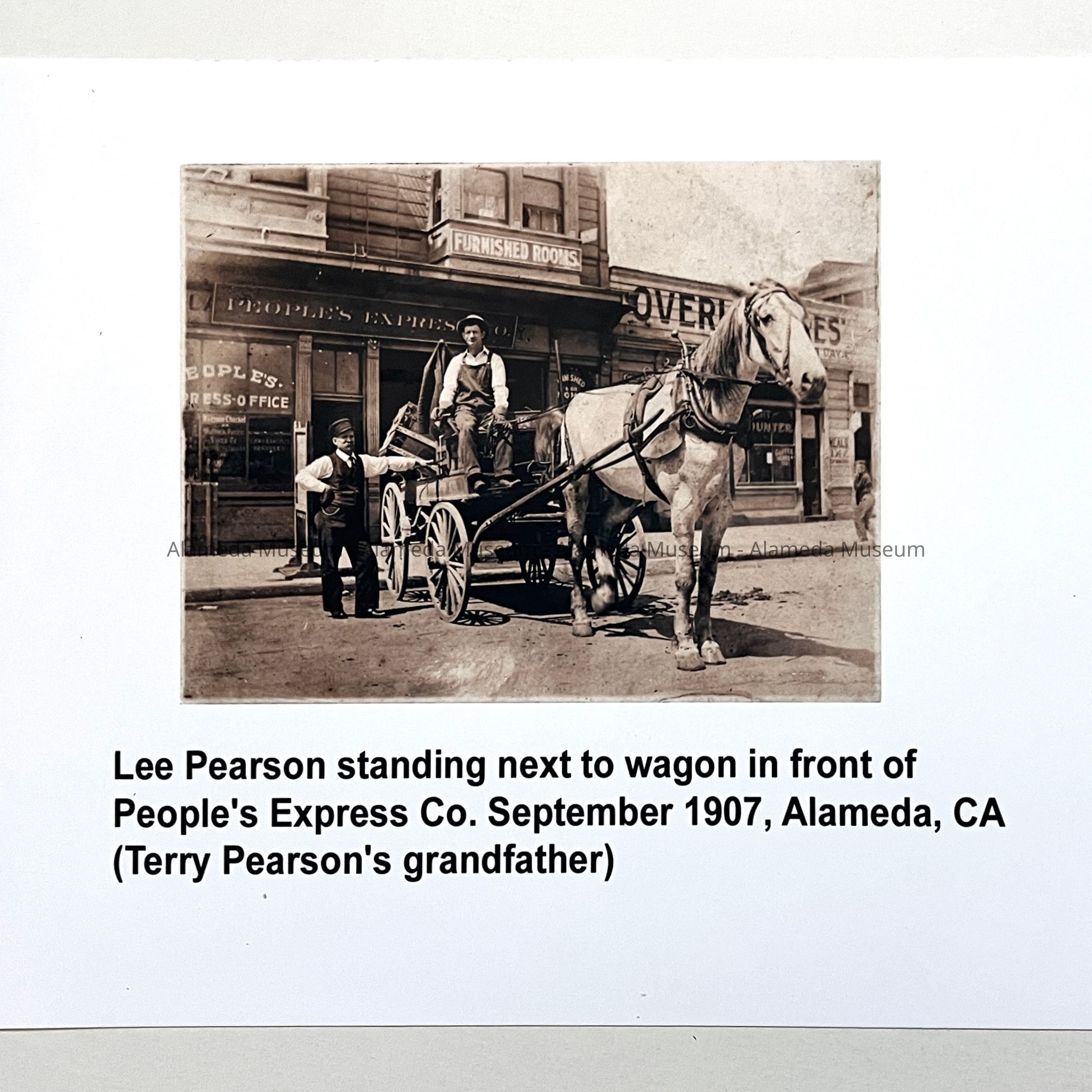 HISTORY OF OBJECT: A PHOTO OF LEE PEARSON ON SEPTEMBER 1907, STANDING NEXT TO A WAGON IN FRONT OF HIS OFFICE BUILDING. LEE PEARSON WAS THE GRANDFATHER OF THE DONOR.